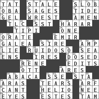 ACROSS 1. Make lace 4. Lacking originality or spontaneity 9. Oscar Madison type 13. Chief or king in Benin or Nigeria 14. Gurus 15. Event that recurs at intervals 16. Set 17. Obtain by seizing forcibly or violently 18. So be it 19. Affectionate concern, for short 21. Fast jet (abbr.) 22. Ethiopian city, capital of Harari 24. Native american tent (variation) 26. Single 27. Declaim 29. Arab leader 30. An organ shaped like a helmet 31. Title for a man of rank and authority 33. Electrical Unit 36. Whopper 37. Boisterous (Brazilian Portuguese) 40. Ocean 41. Followers of ems 42. Angers 43. Administered medicine 45. French philosopher Descartes 47. Prepares for publication 48. Baseball player Mel 49. Ancient Greek god of war 50. Phillipine bananalike plant 52. Compass dir. 54. R.R. building 56. Ancient river in northeast Turkey 57. Pulls apart 59. Sandy's bark 61. Patter 62. Sun: prefix 63. Born 64. Sight organs 65. _____ Park, CO 66. Scottish cap DOWN 1. Coat; cloak 2. Collude with 3. Baron Munchausen's specialties 4. Compass dir. 5. Tarsus (plural) 6. Ripens 7. For fear that 8. Eastern Standard Time (abbr.) 9. A viewer who gazes fixedly 10. Pale green bean 11. Baltic tributary 12. Benjamin's nick name 20. Quote 22. Dwellings 23. Cuckoo 25. Lightbulb-shaped fruit 27. Stare at amorously 28. Precipitation 29. Greek god of love 31. The founder of a family 32. Binary compound 33. Helper 34. Rendezvous 35. Groovy apts. 38. National forest in Provo, Utah 39. Baltic tributary 44. Lyric poems 45. Ridicules or criticizes harshly 46. And so on (abbr.) 49. Nest on high 50. Like ___ of sunshine 51. Object of repulsion 52. Perceives with the eye 53. Table seasoning 55. Type of rug 56. Adept person 57. Definite Article 58. Distress signal 60. Opposite of masc.
