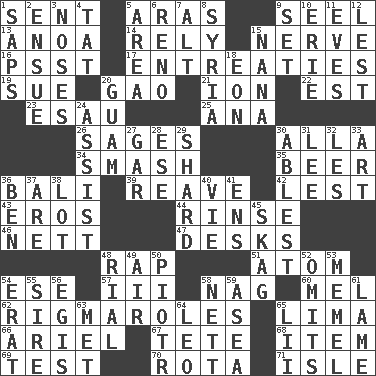 ACROSS 1. Transmitted 5. Ancient river in northeast Turkey 9. Sew up the eyelids of hawks and falcons 13. Small Philippine buffalo 14. Have trust in 15. Boldness 16. Inconspicuous attention getter 17. Pleas 19. Take to court 20. E Mali city 21. Electrically charged atom 22. Eastern Standard Time (abbr.) 23. Son of Isaac 25. Santa ___, CA 26. Gurus 30. Silent film actress Nazimova 34. Box-office sellout 35. Fermented drink made from hops 36. Indonesian resort city 39. Break or tear apart 42. For fear that 43. Greek god of love 44. Wash lightly 46. Remaining after all deductions 47. Writing tables 48. Strike 51. Tiny particle 54. Compass dir. 57. One more than two 58. Tired old horse 60. Cartoonist voice _ Blanc 62. Frustrating wastes of time 65. Pale green bean 66. Satellite of Uranus 67. False hair 68. A whole individual unit 69. Trial 70. Round or rotation of duties 71. Capri or Wright DOWN 1. Plant excrements 2. Follow as a consequence or result 3. Olfactory organs 4. Make lace 5. Type of rug 6. Western Nevada city 7. The first octave above the treble staff 8. Damascus' land 9. Put into a specified state 10. One of the Great Lakes 11. Nights before holidays 12. For fear that 15. Grandmother 18. Period of immesurable duration 20. Island territory of the United States 24. Aid 27. Slender fish 28. Compass dir. 29. Pottery fragment 30. Most capable 31. Area sheltered from the wind 32. French article 33. Nonscientific branch of learning 36. Benjamin's nick name 37. "We ___ not amused" (Victoria) 38. Car dealer's back yard 40. Compete 41. Followers of ems 45. Heroin 48. Monetary unit of Yemen 49. Wind 50. Peter (Polish) 52. Leaves out 53. Klaipeda city 54. Part of Q.E.F. 55. Male parent of an animal 56. The front part of a cuirass 58. Remaining after all deductions 59. At sea 61. Unable to walk 63. Was introduced to 64. Lion 65. Cards in a Roman deck?