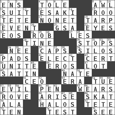 ACROSS 1. Followers of ems 4. Lacquered or enameled metalware 8. Leather borer 11. Costume for a special activity 13. 1973 Nobel Price Winner (Physics) Leo 15. Friend of Pooh 16. False hair 17. Music written for nine 18. Canvas cover 19. Happening 21. Girls' org. (abbr.) 22. Sight organs 23. Greek goddess of the dawn 24. Director Reiner 27. French article 29. Prong on a fork 30. Constricts 34. Born 36. Balmoral and tarboosh 39. Grain storage towers 40. Writing tablets 41. Choose 43. Certainty 44. Join together 46. Greek god of love 47. Car dealer's back yard 48. Smooth fabric 49. Nathan's nickname 51. Corporate head (abbr.) 53. Epoch 54. Third day of the wk. 57. Tending to cause great harm 60. Fenced enclosure 63. Puts on (as clothing) 65. Be footloose 66. Originate 69. Three-handed card game 70. According to 71. Rings 72. False hair 73. "___ Little Indians" 74. Trial 75. Observe DOWN 1. First name in cosmetics 2. New (sp.) 3. Settings 4. "___ Little Indians" 5. Bear (Spanish) 6. Austrian-born American filmmaker Fritz 7. Makes supply last 8. Like ___ of sunshine 9. Had on 10. Chops off 12. Nine, plus one 14. Slanted text style (abbr.) 18. A testis 20. Three (prefix) 25. At one time in the past 26. Memphis, Tenn. Street 28. Double-curved letter 29. One of the two male reproductive glands 31. Butter sub 32. Left side of a ship or aircraft 33. Fast jet (abbr.) 34. Grandmother 35. Prepare for publication 37. For each 38. Biscuitlike quick bread 40. Purulenc 42. Russian ruler of old 45. Compass dir. 50. The 23rd letter of the Hebrew alphabet 52. Brightly colored fish 54. Proceeds 55. A salt of uric acid 56. First name in cosmetics 57. Part of Q.E.F. 58. Short-tailed, large-bodied rat 59. _ the terrible 61. Part of Q.E.F. 62. Mediterranean tributary 64. Eastern Standard Time (abbr.) 67. Mayday 68. Eastern Standard Time (abbr.)