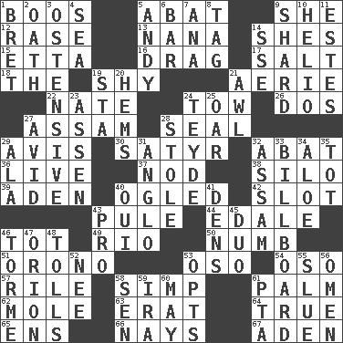 ACROSS 1. Scornful sounds 5. Blind as ____ 9. A female animal or person 12. Raze (variant) 13. Nanny 14. "______ My Girl" (Turtles hit) 15. Singer James 16. To draw with force 17. Table seasoning 18. Definite Article 19. Like a shrinking violet 21. Nest on high 22. Nathan's nickname 24. Pull behind 26. Two (Sp.) 27. Indian state 28. Lick closed 29. Opinion 30. Man with strong sexual desires 32. Blind as ____ 36. Moving, as bait 37. Lower and raise head in agreement 38. Grain storage tower 39. Arabian gulf 40. Stared 42. Notch 43. Whimper 44. Peak District village in England 46. Small child 49. River (Sp.) 50. Unfeeling 51. U. of Maine site 53. Bear (Spanish) 54. Bear (Spanish) 57. Cause heat under the collar 58. Simple or foolish person 61. Inside of hand 62. Undercover agent 63. Part of Q.E.F. 64. Loyal 65. Followers of ems 66. Negative votes 67. Arabian gulf DOWN 1. Cy Young winner Saberhagen 2. Pledge 3. Clearly or manifestly demonstrative 4. Ocean 5. "60 Minutes" Commentator Rooney 6. Tavern 7. Santa ___, CA 8. Label 9. Broken piece 10. Sun: prefix 11. _____ Park, CO 14. Compass dir. 19. R.R. building 20. Folds over and sews together 21. Leather borer 23. NE Netherlands city 24. Miss Universe 1986, Barbara Palacios _ 25. Rowing implement 27. Enthusiastic 28. Fur scarf 29. Insect wing 31. White American of non-Hispanic descent 32. Indian state 33. Big road sign 34. Medicinal plant 35. Small child 40. Fr. "Yes" 41. Cub Scout units 43. Adept person 45. Superhero pair 46. Singer Mel 47. Constellation of myth 48. For Whom the Bell _____ 52. Born 53. Elects 55. Change direction abruptly 56. Sign of something about to happen 58. Elected rep. 59. Lyricist Gershwin 60. Fifth month 61. Parent Teacher Assoc.