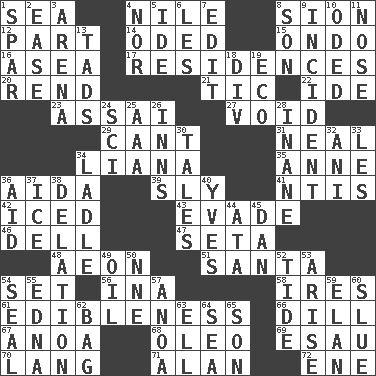 ACROSS 1. Ocean 4. Mediterranean tributary 8. The Jewish people; Israel 12. Piece 14. Wrote a lyric poem 15. Southwest Nigerian state 16. Toward the sea 17. Homes 20. Tear apart 21. Nervous spasm 22. Binary compound 23. Slender Brazilian palm 27. State of nonexistence 29. Patter 31. Actress Patricia 34. Woody, climbing, usually tropical plant 35. Singer Murray 36. Opera by Verdi 39. Playfully artful 41. Nuclear Threat Initiatives 42. On the rocks 43. Elude 46. Small valley 47. Bristle 48. A really long time 51. Before Barbara or Clara 54. Arrange properly for use 56. _ tizzy (2 wds.) 58. Angers 61. The property of being fit to eat 66. Deli pickle 67. Small Philippine buffalo 68. Margarine 69. Son of Isaac 70. Austrian-born American filmmaker Fritz 71. Actor Alda or Thicke 72. Compass dir. DOWN 1. Coast Guard woman 2. Comfort 3. Sports stadium 4. Not either 5. Binary compound 6. French article 7. Prepare for publication 8. Manchild 9. Happening 10. Wrote a lyric poem 11. Characteristic smell of wine 13. Bits 18. HTML Container Element 19. Environmental prefix 24. _-fi 25. Auto club (abbr.) 26. Restaurants 28. Empty; void 30. Lies 32. Black tropical American cuckoo 33. French article 34. Dipping utensil 36. Assist 37. Frozen water 38. Accusation by an informer 40. Jacques Cousteau's middle name 44. "One Day ___ Time" 45. Daniel's nick name 49. Petroleum 50. Compass dir. 52. Event that recurs at intervals 53. Ascend 54. Lick closed 55. Pulitzer Prize-winning author Ferber 57. Small Philippine buffalo 59. Style 60. Change direction abruptly 62. Paper or plastic container 63. Pipe bend 64. Ocean 65. Male child