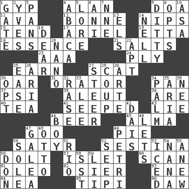 ACROSS 1. Con 4. ____ Jay Lerner 8. ___ good deed 11. Actress Gardner 12. Maid-servant 14. Cuts off 15. Look after 17. Satellite of Uranus 18. Singer James 19. Core 21. Table seasonings 23. Auto club (abbr.) 24. Apply oneself diligently 25. Merit 27. Get outta here! 30. Boat paddle 31. Speaker 34. Baking dish 37. Air pressure measure (abbr.) 38. Native American of Southwest Alaska 39. "We ___ not amused" (Victoria) 40. Beverage made from leaves 41. Oozed 43. Untruth 44. Fermented drink made from hops 45. _ mater 47. Thick or sticky substance 49. Sliced dessert 50. Letch 52. French poetic form 56. Stupid person 57. Small island 60. Examine hastily 61. Butter sub 62. Flexible twig of a willow tree 63. Compass dir. 64. Teachers' org. 65. Native american tent (variation) 66. Obsolete DOWN 1. Yard entry 2. Jacques Cousteau's middle name 3. Baking dishes 4. Phillipine bananalike plant 5. Old wives' tales, e.g. 6. Black tropical American cuckoo 7. Compass dir. 8. Simple song 9. Elects 10. White ___ sheet 13. Raised railways 14. 1994 drama film starring Jodie Foster 16. Letter starter 20. Billionth: prefix 22. Fitting 25. Relaxation 26. Operatic vocal solo 27. Bull 28. Overturn; upset 29. Johnson of "Laugh-In" 30. Choose 32. To erase 33. Toward shelter 34. Inside of hand 35. Operatic vocal solo 36. Born 42. Raised platform 44. Male child 46. Allows 47. An organ shaped like a helmet 48. Von Bismarck 49. _ dish (used to culture cells) 50. Not divided or shared with others 51. _ de Janeiro 52. Ooze 53. On the rocks 54. Nanny 55. Afresh 56. Spanish title 58. Fast jet (abbr.) 59. Cards in a Roman deck?