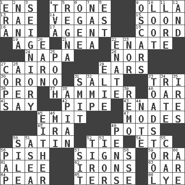 ACROSS 1. Followers of ems 4. Heavy duty weighing machine 9. Rounded earthenware pot or jar 13. Actress Charlotte 14. Viva Las _ 15. Within a short period 16. Cuckoo 17. Representative 18. Drawstring 19. Mature 21. Teachers' org. 22. Related on the mother's side 24. California wine valley 26. And not 27. Capital of Egypt 29. Hearing organs 30. U. of Maine site 31. Table seasoning 33. Three (prefix) 36. For each 37. More given to overacting 40. Rowing implement 41. Declare 42. Corncob 43. Related on the mother's side 45. Send forth 47. Methods 48. Retirement account (abbr.) 49. Plant holders 50. Smooth fabric 52. Standoff 54. And so on (abbr.) 56. Expression of disdain 57. Omens 59. Mouth or opening 61. Toward shelter 62. Removes the wrinkles 63. Rowing implement 64. Lightbulb-shaped fruit 65. Laconic 66. Sodium hydroxide DOWN 1. Epoch 2. Nanny 3. Signiory (variant) 4. Federal power corp. 5. Canadian anthropologist Darnell 6. Double curve, resembling the letter S 7. Grandmother 8. Eastern Standard Time (abbr.) 9. Motion picture awards 10. Plunder 11. Old wives' tales, e.g. 12. Also 20. Merit 22. Maternal 23. And not 25. "Silly old bear" 27. 911 reaches them 28. Type of rug 29. Writer Wiesel 31. Stricken, poetically 32. Electrical Unit 33. Inedible or poisonous agaric 34. Pace 35. Angers 38. Bee-related 39. San ____ (Riviera town) 44. Musical sound 45. One or the other of two 46. Medical imaging device (abbr.) 49. Actor Sean's family 50. Drop; flow; fall 51. At sea 52. Become fatigued 53. Composer Stravinsky 55. Supercomputer manufacturer 56. Infant food 57. Be seated 58. Compass dir. 60. "We ___ not amused" (Victoria)