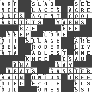 ACROSS 1. Sandy's bark 4. Broad, flat, thick piece 8. Observe 11. Born 12. Shoestrings 14. 43,560 square feet 15. Singles 17. Rep 18. Calm and collected 19. Inveterate users 21. Tall tales 23. Actress Charlotte 24. To separate or throw off 25. Ooze 27. Old wives' tales, e.g. 30. Baseball player Mel 31. Fodder prepared in a silo 34. "We ___ not amused" (Victoria) 37. Benjamin's nick name 38. Cowboy competition 39. 54 in ancient Rome 40. "One Day ___ Time" 41. Most capable 43. Madame (abbr.) 44. Leg joint 45. Son of Isaac 47. Santa ___, CA 49. 24 hours 50. Naughty children 52. More disrespectful 56. Precipitation 57. The state of being joined or united 60. Relationship diagram 61. Margarine 62. Learning spot: Fr. 63. Raised railways 64. Petroleum 65. Washington bills 66. Fast jet (abbr.) DOWN 1. Small Philippine buffalo 2. Tear apart 3. Nourish 4. Chalkboard 5. Fails to keep up a pace 6. Adept person 7. Benjamin's nick name 8. Biscuitlike quick bread 9. Greek god of love 10. Snakelike fish 13. Filthy place 14. 43,560 square feet 16. The founder of a family 20. Balmoral and tarboosh 22. "We ___ not amused" (Victoria) 25. Proofreading order 26. Inactive volcano in Sicily 27. Dipping utensil 28. Double curve, resembling the letter S 29. Vintage cars 30. Chief or king in Benin or Nigeria 32. SW Asia republic 33. Ear part 34. _ mater 35. Tall New Zealand timber tree 36. Night before a holiday 42. Afternoon social gatherings 44. Krazy ___ of comics 46. System (abbr.) 47. Satellite of Uranus 48. Billionth: prefix 49. Natives or inhabitants of Denmark 50. Indonesian resort city 51. Take to court 52. Flatfish 53. Angers 54. Snakelike fish 55. Repose 56. Friend of Pooh 58. Non-commissioned officer (abbr.) 59. Electrically charged atom