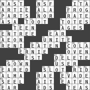 ACROSS 1. Political cartoonist Thomas 5. Overdraft (abbr.) 8. Call ___ day 11. Nick name for Arthur 13. In the manner of 14. Tree-dwelling hopper 15. Pieces 16. And not 17. Assign a rank or rating to 18. White ___ sheet 19. A blast of a horn 21. Lugs 22. Adolescent 24. Ripens 25. Main course 27. Ewer handle 29. Age 30. Join together 32. Painter Guido (1575-1642) 33. Eroded 35. Root beer relative 39. Bert's buddy 41. Baking chamber 42. Eastern Standard Time (abbr.) 43. Erase 45. Bride's dress 48. One who uses or employs something 49. Having ears or earlike features 50. Slit 52. To free from 55. _ mater 56. Actress Charlotte 57. Elude 59. Sew up the eyelids of hawks and falcons 60. Small island 61. Consumed 62. Ewer handle 63. Begley and Asner 64. Beverages made from leaves DOWN 1. California wine valley 2. Ancient river in northeast Turkey 3. Ski resort town in Vermont 4. Teat (slang) 5. Billionth: prefix 6. Notch 7. Distant 8. Feeling or showing extreme anger 9. Hauls 10. Ripens 12. First name in cosmetics 14. Toadlike animal 20. Single 21. Small pie 23. Bert's buddy 25. Ewer handle 26. Born 27. Compass dir. 28. The 18th letter of the Arabic alphabet 30. Shoshoni 31. Learning spot: Fr. 33. Followers of ems 34. Small island 36. Make much ado about nothing 37. Allow 38. One (Scot) 40. Tear apart 43. Superhero pair 44. First name in cosmetics 45. An organ shaped like a helmet 46. Abalone 47. Welt 49. Comfort 50. Expressed in words 51. Allows 53. It may be bright or harebrained 54. Hiding places for outlaws 56. Actress Charlotte 58. Large container