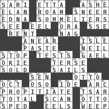 ACROSS 1. Indian skirt 5. Singer James 9. American tennis player Robert 13. Liveliness 14. Wander aimlessly 15. Scornful expression 16. Pulitzer Prize-winning author Ferber 17. Wine waiters 19. Observe 20. Snakelike fish 21. Mouth or opening 22. Compass dir. 23. Monthly bill 25. Tired old horse 26. Approach 30. Capri or Wright 34. Thick mixture 35. Famous astronaut Armstrong 36. Constrict 39. Trials 42. Highlander 43. Migrant worker of the '30s 44. Laconic 46. Exchanged or delivered for money 47. Moves on water 48. Elected rep. 51. Von Bismarck 54. Sep. follower 57. Bear (Spanish) 58. Binary compound 60. Curve 62. Conciliate 65. Russian ruler of old 66. "_____ Recall" 67. Glance over 68. Von Bismarck 69. Drove too fast 70. Snakelike fish 71. Shed a tear DOWN 1. Observes 2. Tree or shrub in the Birch family 3. Indian princess (variant) 4. _ tizzy (2 wds.) 5. Celtic language 6. Utensil 7. Scottish cap 8. ID or VA city 9. Black tropical American cuckoo 10. Observes 11. Possessive pronoun 12. Celtic language 15. Volcanic refuse 18. Epoch 20. Inactive volcano in Sicily 24. Slept 27. Eastern Standard Time (abbr.) 28. Had dinner 29. Musical pauses 30. Eat 31. Ocean 32. Whopper 33. Pipe bend 36. Distress signal 37. Ring climax 38. Lubricate 40. Beverage made from leaves 41. _ Lanka 45. A type of plum 48. Earth 49. Eastern Standard Time (abbr.) 50. Annoying sound 52. Clothes sense 53. Speak pompously 54. Elects 55. Riding implement 56. Carryall 58. Slanted text style (abbr.) 59. Habitations of wild animals 61. Riding implement 63. Writing tablet 64. Adept person 65. Pull behind
