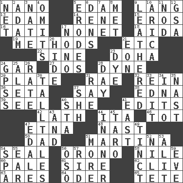 ACROSS 1. Billionth: prefix 5. Dutch treat 9. Long (Scottish) 13. Dutch treat 14. French philosopher Descartes 15. Greek god of love 16. Jacques of French films 17. Music written for nine 18. Opera by Verdi 19. Modes 21. And so on (abbr.) 22. Trig term 23. Capital of the state of Qatar 24. Slender fish 27. Two (Sp.) 28. Centimeter-gram-second unit of force 29. Food holder 31. Actress Charlotte 32. It's straight from the horse's mouth 36. Bristle 37. Declare 38. Pulitzer Prize-winning author Ferber 39. Sew up the eyelids of hawks and falcons 40. A female animal or person 41. Proofreads 42. Thin strip of wood or metal 44. Call ___ day 46. Small child 47. Inactive volcano in Sicily 48. Political cartoonist Thomas 50. June honoree 51. Chrissie's court nemesis 54. Lick closed 56. U. of Maine site 58. The longest river in the world 60. Diluted with white 61. The founder of a family 62. 154 in Roman numerals 63. Ancient Greek god of war 64. River in Europe 65. Wig DOWN 1. Fish or hair follower 2. First of billions? 3. Nathan's nickname 4. Leaves out 5. Eats (away) 6. Cub Scout units 7. A saturated hydrocarbon 8. Was introduced to 9. Tough but pliablecoriaceous 10. N. Chile seaport 11. Allow head to fall sleepily 12. Girls' org. (abbr.) 17. Words to Nanette 20. Flintstone garb 21. Period of immesurable duration 23. Color 24. Global Positioning Systems (abbr.) 25. Toward shelter 26. Pace 28. 24 hours 30. Baron Munchausen's specialties 31. Actress Charlotte 33. Prepare for publication 34. To the inside or interior of 35. Political cartoonist Thomas 37. Quiet! 40. R.R. building 41. Compass direction 43. Plus 44. More empty; more void 45. Pacific island yam 47. Peak District village in England 49. Colored lightly or faintly 51. Greater amount 52. Mediterranean tributary 53. Came down and settled, as after flight 54. Health resort 55. Hearing organ 56. Bear (Spanish) 57. To free from 59. First lady