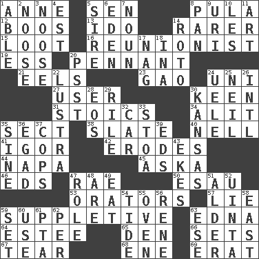 ACROSS 1. Singer Murray 5. Elected rep. 8. Monetary unit of Botswana 12. Expressions of contempt or scorn 13. Wedding promise 14. More valued for its uncommonness 15. Spoils 16. One who advocates reunion 19. Double-curved letter 20. Pre-World Series prize 21. Snakelike fish 23. E Mali city 24. Corn or form start 27. One who makes use of a thing 30. Peachy ____! 31. Unemotional ones 34. Set down 35. Religious group 38. Chalkboard 40. 1994 drama film starring Jodie Foster 41. Composer Stravinsky 42. Eats (away) 44. California wine valley 45. "____ silly question..." 46. Begley and Asner 47. Actress Charlotte 50. He sold his birthright 53. Speakers 57. Untruth 59. Supplementary 63. Pulitzer Prize-winning author Ferber 64. First name in cosmetics 65. Lair 66. Puts into a specified state 67. Lacerate 68. Compass dir. 69. Part of Q.E.F. DOWN 1. Competent 2. Trap for birds or small mammals 3. Trap for birds or small mammals 4. Eastern Standard Time (abbr.) 5. The founder of a family 6. Locale of original sin 7. Part of speech 8. Baking dish 9. RI univ. 10. French article 11. Tate display 14. Printing process, for short 17. Tired old horse 18. _ tizzy (2 wds.) 20. Inconspicuous attention getter 22. A period of five years 24. Ubangi River tributary 25. Famous astronaut Armstrong 26. International (abbr.) 28. Greek goddess of the dawn 29. Cause heat under the collar 30. Sunflower state 32. Auto 33. Portico 35. Trig term 36. Mild oath 37. 911 reaches them 39. Begley and Asner 43. Makes supply last 47. Hero or heavy, e.g. 48. "We ___ not amused" (Victoria) 49. Consume 51. Tree or shrub in the Birch family 52. National forest in Provo, Utah 54. Event that recurs at intervals 55. Baking chamber 56. French philosopher Descartes 58. 90 degrees 59. Arrange properly for use 60. Purpose 61. Parent Teacher Association (abbr.) 62. For each 63. Compass dir.