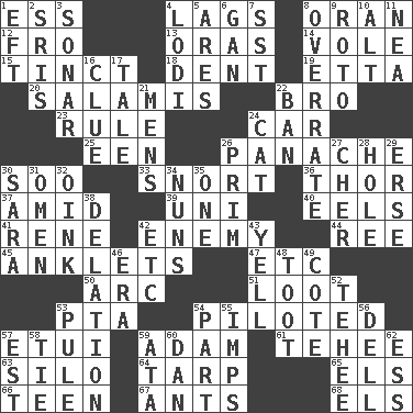 ACROSS 1. Curvy letter 4. Fails to keep up a pace 8. Northwest Algerian city 12. Back 13. Mouths or openings 14. Grand slam 15. Tinged 18. Gouge 19. Singer James 20. Deli grouping 22. Sis' sibling 23. Court order 24. Auto 25. Car or cant ending 26. Flamboyance 30. "Barney Miller" actor Jack 33. Derisive sound 36. Son of Odin 37. Among 39. University (slang) 40. Snakelike fish 41. French philosopher Descartes 42. Foe 44. To riddle 45. Short socks 47. And so on (abbr.) 50. Curve 51. Spoils 53. Parent Teacher Assoc. 54. Manned the helm 57. Needle holder 59. First of billions? 61. Giggle 63. Grain storage tower 64. Canvas cover 65. Raised railways 66. Adolescent 67. Pismires 68. Raised railways DOWN 1. Bank Draft (abbr.) 2. Indian titles of respect 3. Underwater navigation system 4. Farming town in central California 5. Ancient Greek god of war 6. Separate the seeds from cotton 7. Fast jet (abbr.) 8. Make much ado about nothing 9. Printing process, for short 10. The first octave above the treble staff 11. Teachers' org. 16. A slight indication 17. Falsehood 21. Not women's 22. Bar 24. Domesticated feline 26. Demure 27. "Mermaids" star 28. Hollow 29. Celtic language 30. "Two Mules for Sister ____" 31. Presage 32. Pig sound 34. Religious women 35. Single 38. Accusation by an informer 42. And so on (abbr.) 43. Shout 46. Period 48. A blast of a horn 49. ____ d'Azur (French Riviera) 52. Giggle 53. Whine 54. Role in a play 55. Naughty children 56. Small valley 57. Eastern Standard Time (abbr.) 58. Make a knot 59. "One Day ___ Time" 60. One of the 12 tribes of Israel 62. Curvy letter
