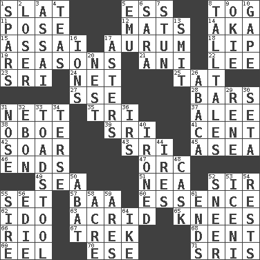 ACROSS 1. Narrow board 5. Curvy letter 8. Coat; cloak 11. Introduce or present, as a question 12. Floor coverings 14. Alias (abbr.) 15. Slender Brazilian palm 17. Gold (Symbol: Au) 18. Mouth edge 19. Thinks logically 21. Cuckoo 22. Area sheltered from the wind 23. _ Lanka 24. Fish or hair follower 25. Make lace 27. Compass dir. 28. Taverns 31. Remaining after all deductions 35. Three (prefix) 37. Toward shelter 38. Mitch Miller's instrument 39. Indian title of respect (Mr.) 41. Penny 42. Fly high 43. _ Lanka 45. At sea 46. Conclusions 47. The grampus (Milton) 49. Ocean 51. Teachers' org. 52. Title for a knight 55. Put into a specified state 57. Sound made by sheep 60. Center 62. Wedding promise 63. Sour-tasting 65. Leg joints 66. River (Sp.) 67. Long journey 68. Gouge 69. Snakelike fish 70. Compass dir. 71. Indian titles of respect DOWN 1. Practice fights 2. Failure 3. Slender Brazilian palm 4. Afternoon social gatherings 5. Australian flightless bird 6. "Two Mules for Sister ____" 7. Astound 8. Baron Munchausen's specialties 9. Migrant worker of the '30s 10. Stare wonderingly 13. Stricken, poetically 16. Charged particles 17. Michaelmas daisies 20. A home for chicks 26. Phillipine bananalike plant 29. French philosopher Descartes 30. Stalk of a moss capsule 31. Characteristic smell of wine 32. Inky black, to poets 33. Inedible or poisonous agaric 34. Laconic 36. Big collection agency 40. Pressed 44. Angers 48. Keg 50. Blind as ____ 52. Contemptuous expression 53. Ancient Celtic tribe of eastern Britain 54. Musical pauses 55. Male parent of an animal 56. Singer Brickell 58. 43,560 square feet 59. Ancient Greek god of war 61. Extremities 64. Eisenhower's nickname