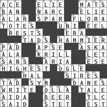 ACROSS 1. Adept person 4. Writer Wiesel 8. Floor coverings 12. Forbid 13. Drug cop 14. Writer Wiesel 15. Having or resembling wings 17. Coast Guard woman 18. Plants 19. Hauls 21. University (slang) 23. Snakelike fish 24. Musical pauses 26. Epoch 28. Small amounts or degrees 30. More overdramatic by comparison 34. Writing tablet 37. Domed church section 39. "____ silly question..." 40. In the manner of 41. The principal food of baleen whales 43. Allow 44. Without 46. Operatic vocal solo 47. Compass dir. 48. Having the greatest elevation 51. Stare at amorously 54. Actor Linden 55. Founders of families 58. Bit 61. Symbol (abbr.) 63. Natives or inhabitants of Denmark 65. Compose 67. Spanish pot 71. Lie 72. Opera by Verdi 73. Fermented drink made from hops 74. Affectionate concern, for short 75. Expressed in words 76. Proofreading order 77. Eastern Standard Time (abbr.) DOWN 1. Blind as ____ 2. Bodily heat indicating an inflammation 3. Maternal 4. Followers of ems 5. Infant locale 6. Lyricist Gershwin 7. Shade of tan 8. Cartoonist voice _ Blanc 9. _ vera 10. Hoop that covers a wheel 11. Lick closed 16. Repose 18. Become taut 20. R.R. building 22. Teachers' org. 25. Neighbor of Neb. 27. Wet nurse (var.) 29. Small fatty European fish 30. Sun: prefix 31. Capri or Wright 32. Supplements with great effort 33. Pace 34. Romantic infatuation 35. Jai _ 36. Mild oath, euphamism for damn 38. Title for a knight 42. Straggles 45. Quiet! 49. Comfort 50. Wily 52. Flaplike covering 53. Part of Q.E.F. 56. Maternal 57. Exchanges for money 58. It was, poetically 59. Roberta Peters solo 60. "You Light Up My Life" star Conn 62. Disorderly crowds 64. Religious group 66. Bit 68. Allow 69. Area sheltered from the wind 70. Tate display
