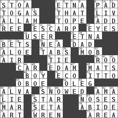 ACROSS 1. Portico 5. Inactive volcano in Sicily 9. Groovy apt. 12. Ancient Roman robes 14. Not this but _ 15. 54 in ancient Rome 16. Assad's deity 17. Drink excessively 18. Increase 19. To sift 20. Fortification 23. Sight organs 24. One who makes use of a thing 25. Inactive volcano in Sicily 27. Antes 30. Teachers' org. 32. June honoree 33. Medicinal plant 34. Bar bills 36. Crowd into 38. Atmosphere 39. Make a knot 40. Friend of Pooh 43. Automobile 46. Dutch treat 48. Floor protectors 49. Male child 51. Environmental prefix 52. "Tell ____ the Marines!" 53. Mitch Miller's instrument 54. Cassini of fashion 56. Inventor's middle name 58. Frozen precipiation fell 61. Housemaid (var.) 64. Untruth 65. Play the lead 66. Olfactory organs 68. Spoil 69. Stalk of a moss capsule 70. Remain 71. Tate display 72. Songbird 73. Type of rug DOWN 1. Play the lead 2. Lacquered or enameled metalware 3. Stare 4. Auto club (abbr.) 5. Singer James 6. Son of Odin 7. Slept 8. Had dinner 9. Beach, in Buenos Aires 10. Assistant 11. Movie discs 13. "______ My Girl" (Turtles hit) 21. Posted 22. Make 23. Inside; within (prefix) 24. Purpose 26. Scottish cap 27. Sound made by sheep 28. Connecticut Ivy Leaguer 29. Torque (variant) 31. Tolerate 35. Manatee 37. Naughty child 41. Baseball player Mel 42. Bear (Spanish) 44. Swedish rock group 45. Friend of Pooh 47. Undercover agent 48. Russian fighter aircraft 50. Of or pertaining to yesterday 53. Unconcealed 55. Pulitzer Prize-winning author Ferber 56. _ mater 57. One who doesn't tell the truth 59. Nathan's nickname 60. Northwest Algerian city 61. SW Saudi Arabia district 62. Ancient Persian 63. Toward the sea 65. Compass dir. 67. Chief or king in Benin or Nigeria