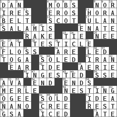 ACROSS 1. One of the 12 tribes of Israel 4. Crowds into 8. And not 11. Angers 13. Greek god of love 14. Israeli folk dance 15. Waist strap 16. Highlander 17. Uhlan (variant) 18. Deli grouping 21. Maternal 22. Libertine 23. Make a knot 25. Born 26. Ingest 29. One of the two male reproductive glands 32. Soft thread for cleaning between teeth 34. "We ___ not amused" (Victoria) 35. Directed 38. Ancient Roman robe 39. Having a sole or soles 41. SW Asia republic 43. Ewer handle 44. Binary compound 45. Nest on high 46. Swallowed 50. Compass dir. 51. Actress Gardner 54. Conclude 55. Conclusions 57. Haggard of country music 59. Inhabiting a nest 63. Double curve, resembling the letter S 64. Disposed of to a purchaser 67. The content of cognition 68. Billionth: prefix 69. Algonquian 70. Relief 71. Girls' org. (abbr.) 72. On the rocks 73. Had dinner DOWN 1. Claim 2. Type of rug 3. 1994 drama film starring Jodie Foster 4. Makes clutter 5. The grampus (Milton) 6. Sometimes accompanies a hiss 7. Fast jet (abbr.) 8. Pitcher Ryan 9. Speak pompously 10. Indian princess (variant) 12. Play the lead 14. Attila the _ 19. Floor coverings 20. Mamie's mate 21. Snakelike fish 23. Hoop that covers a wheel 24. On the rocks 26. Bank Draft (abbr.) 27. Medicinal plant 28. Ancient Roman robe 30. Stories 31. Writer Wiesel 33. Indian skirt 36. Blunders 37. Raised platform 39. Public display of a written message 40. Wrote a lyric poem 42. Born 45. Sums up 47. Born 48. Looked after 49. Compass dir. 51. Amid 52. Viva Las _ 53. Sports stadium 56. Use a spoon 58. Lion 60. The content of cognition 61. A home for chicks 62. Yard entry 64. _-fi 65. The grampus (Milton) 66. Area sheltered from the wind