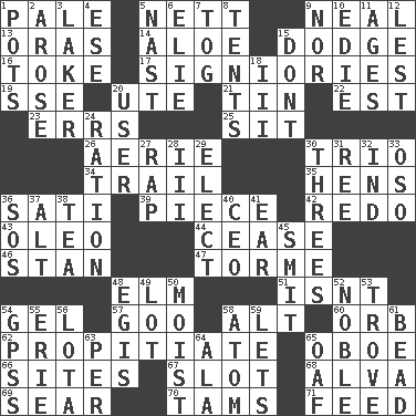 ACROSS 1. Light colored 5. Remaining after all deductions 9. Anneal 13. Mouths or openings 14. _ vera 15. Evade 16. Puff or smoke 17. Seigniories (variant) 19. Compass dir. 20. Shoshoni 21. Metal container 22. Eastern Standard Time (abbr.) 23. Blunders 25. Be seated 26. Nest on high 30. Musical group of three 34. Hang back 35. Coop moms 36. Suttee (variant) 39. Part 42. Do over again 43. Butter sub 44. Stop 46. Comedian Laurel of Laurel & Hardy 47. Singer Mel 48. Shade tree 51. Is not 54. Set 57. Thick or sticky substance 58. The first octave above the treble staff 60. Globe 62. Conciliate 65. Mitch Miller's instrument 66. Locates 67. Narrow opening 68. Inventor's middle name 69. Wither 70. Scottish caps 71. Nourish DOWN 1. Plant holders 2. Came up 3. Member of a famous L.A. basketball team 4. Compass dir. 5. Political cartoonist Thomas 6. Writer Wiesel 7. Coat; cloak 8. Portable shelters 9. Or not 10. Singer Brickell 11. Eras 12. For fear that 15. Do not 18. One more than two 20. One who makes use of a thing 24. Food allowance for one day 27. Strike 28. One more than two 29. Choose 30. Triplets 31. Portuguese money of account (variant) 32. Indiana (abbr.) 33. Bear (Spanish) 36. Mayday 37. Keyboard modifier key 38. Afternoon social gathering 40. Corporate head (abbr.) 41. Ewer handle 45. Stricken, poetically 48. The front part of a cuirass 49. Car dealer's back yard 50. Damp 52. Having high moral qualities 53. Collection of objects 54. Global Positioning Systems (abbr.) 55. 4th largest of the Great Lakes 56. Globular water bottle used in Asia 58. Smallest unit of an element 59. Allows 61. Necklace unit 63. For each 64. According to 65. Clumsy lout
