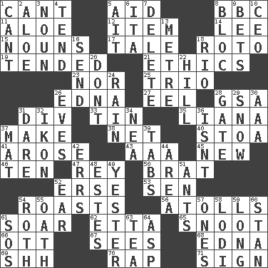 ACROSS 1. Patter 5. Help 8. English channel? 11. _ vera 12. Detail 14. Area sheltered from the wind 15. Parts of speech 17. Falsehood 18. Printing process, for short 19. Looked after 21. Moral principles 23. And not 25. Musical group of three 26. Pulitzer Prize-winning author Ferber 27. Snakelike fish 28. Girls' org. (abbr.) 31. HTML Container Element 33. Metal container 35. Climbing, woody, usually tropical vines 37. Create 38. Fish or hair follower 40. Portico 41. Came up 43. Auto club (abbr.) 45. ___ Haven, CT 46. Nine, plus one 47. Marina Del _, California 50. Naughty child 52. Celtic language 53. Elected rep. 54. Ridicules or criticizes harshly 56. Ringlike coral islands and reefs 61. Fly high 62. Singer James 65. Snob 66. Baseball player Mel 67. Observes 68. Pulitzer Prize-winning author Ferber 69. Quiet! 70. Hit sharply and swiftly 71. Signal DOWN 1. Patter 2. Medicinal plant 3. Part of speech 4. Watch over 5. Small island 6. Call ___ day 7. Keyboard key 8. Group of countries in special alliance 9. Stakes 10. Corporate head (abbr.) 13. Distance measurement (Brit.) 16. Transmit 18. _ de Janeiro 20. Do not 22. Land elevation 24. Precipitation 26. Nights before holidays 28. Yard entry 29. Frozen precipitation 30. American Automobile Association (abbr.) 31. Have the gumption 32. Image 34. Teachers' org. 36. Is not 37. Floor covering 39. Bar bills 42. Blunders 44. Length times width 48. _____ Park, CO 49. Last 51. Pismires 52. Hearing organ 54. Writer of Portnoy's Complaint (1969) 55. Pledge 57. Singles 58. Farming town in central California 59. Yearn 60. Comedian Laurel of Laurel & Hardy 61. Mayday 63. Afternoon social gathering 64. Cleo's killer