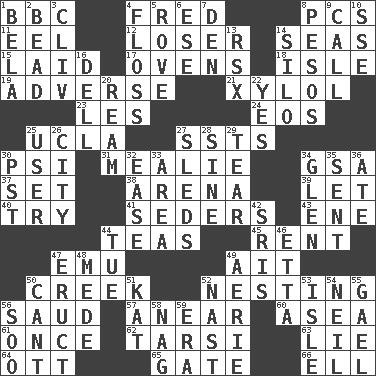 ACROSS 1. English channel? 4. Flintstone 8. Personal Computers (abbr.) 11. Snakelike fish 12. Failure 14. Oceans 15. Put down 17. Baking chambers 18. Small island 19. Contrary to your interests or welfare 21. Xylene (variant) 23. French article 24. Greek goddess of the dawn 25. Southern CA. univ. 27. Fast planes 30. Air pressure measure (abbr.) 31. Ear of corn 34. Girls' org. (abbr.) 37. Put into a specified state 38. Sports stadium 39. Allow 40. Attempt to accomplish something 41. Spring feasts 43. Compass dir. 44. Afternoon social gatherings 45. Monthly bill 47. Australian flightless bird 49. Small island 50. Small stream 52. Snuggling 56. Saudi Arabian king (1953-1964) 57. Approach 60. Toward the sea 61. Single time 62. Tarsus (plural) 63. Falsehood 64. Baseball player Mel 65. Yard entry 66. Pipe bend DOWN 1. Actor Lugosi 2. Necklace unit 3. 154 in Roman numerals 4. Soft thread for cleaning between teeth 5. Be footloose 6. Compass dir. 7. Lair 8. Mexican monetary units 9. Give a ring to 10. Compass dir. 13. Acura sports coupe 14. Grain storage tower 16. Small valley 20. 480, 500 or 516 sheets of paper 22. It is so 25. One who uses or employs something 26. Municipality 27. Bobsleighs 28. Trig term 29. Lacerate 30. Pacific Standard Time (abbr.) 32. Comfort 33. Length times width 34. Small, secluded valley 35. Posted 36. Had dinner 42. Indian titles of respect 44. Third day of the wk. 46. Singer James 47. Spew [out] 48. Ancient Persian 49. Nest on high 50. Patter 51. Krazy ___ of comics 52. Political cartoonist Thomas 53. Small island 54. Famous astronaut Armstrong 55. Highlander 56. "Barney Miller" actor Jack 58. Tired old horse 59. Period