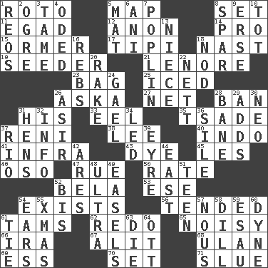 ACROSS 1. Printing process, for short 5. Atlas unit 8. Put into a specified state 11. Mild oath 12. Soon (poet.) 14. Adept person 15. Abalone 17. Native american tent (variation) 18. Political cartoonist Thomas 19. Sowing specialist 21. Poe poem 23. Container for groceries 25. On the rocks 26. "____ silly question..." 27. Fish or hair follower 28. Forbid 31. Part of HMS, perhaps 33. Snakelike fish 35. Sadhe (variant) 37. Painter Guido (1575-1642) 38. Area sheltered from the wind 40. Southeast Asian peninsula 41. Kind of red light 43. Color 45. French article 46. Bear (Spanish) 47. Sorrow 50. Pace 52. Actor Lugosi 53. Compass dir. 54. Is 56. Watched over 61. Scottish caps 62. Redecorate 65. Annoyingly loud 66. Lyricist Gershwin 67. Set down 68. Uhlan (variant) 69. Double-curved letter 70. Arrange properly for use 71. Change direction abruptly DOWN 1. Vintage cars 2. Legendary monster 3. Docile 4. Wrote a lyric poem 5. Floor covering 6. Black tropical American cuckoo 7. Cotton for raincoats, e.g. 8. Coast Guard woman 9. Celtic language 10. Small child 13. Sibling's daughter 16. Confederate soldiers (slang) 18. Lower and raise head in agreement 20. Immoral or dissolute person 22. Remaining after all deductions 24. Highlander 26. SW Saudi Arabia district 28. Object of repulsion 29. Sums up 30. Modern: prefix 31. Coop moms 32. A message received and understood 34. Directed 36. Filth; sediment 37. _ de Janeiro 39. Jane of fiction 42. Ancient Greek god of war 44. 90 degrees 48. Extremist 49. Artist's stands 51. Adolescent 52. Again 54. Hearing organs 55. Dec. holiday 57. Good sense 58. Deli pickle 59. He sold his birthright 60. Centimeter-gram-second unit of force 61. Standoff 63. Pass on 64. Baseball player Mel