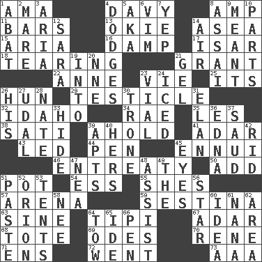 ACROSS 1. Housemaid (var.) 4. American folk hero Crockett 8. Electrical Unit 11. Taverns 13. Migrant worker of the '30s 14. Toward the sea 15. Roberta Peters solo 16. Moist 17. Astrian river, tributary to the Danube 18. Rending 21. Monetary aid 22. Singer Murray 23. Compete 25. It is 26. Attila the _ 29. A testis 32. Potato state 34. Actress Charlotte 35. French article 38. Suttee (variant) 39. Hold, grip (Informal) 41. The sixth month of the Jewish calendar 43. Directed 44. Writing instrument 45. World-weariness 46. Plea 50. Find the sum of 51. Plant holder 54. Curvy letter 55. "______ My Girl" (Turtles hit) 57. Sports stadium 59. French poetic form 63. Trig term 64. Native american tent (variation) 67. The sixth month of the Jewish calendar 68. Carry 69. Lyric poems 70. French philosopher Descartes 71. Followers of ems 72. Left 73. American Automobile Association (abbr.) DOWN 1. Blind as ____ 2. Female horse 3. Roberta Peters solo 4. Evades 5. Alias (abbr.) 6. Zeal 7. Slangy assent 8. Slender Brazilian palm 9. Intended 10. Components 12. "Two Mules for Sister ____" 14. Wind 19. To the inside or interior of 20. Compass dir. 21. Set 23. Small bottle 24. On the rocks 26. Part of HMS, perhaps 27. Hereditary estate 28. Nathan's nickname 30. Marketplace scale 31. Liveliness 33. Flintstone garb 36. Pulitzer Prize-winning author Ferber 37. Saudi Arabian king (1953-1964) 39. Flats, for short 40. Possessive pronoun 42. To free from 45. Sight organs 47. Teachers' org. 48. Aid 49. Definite Article 51. Thick mixture 52. Constellation of myth 53. Portable shelters 56. Play the lead 58. Born 60. The main thing one is thinking about 61. Grandmother 62. Length times width 64. Pull behind 65. Binary compound 66. Writing instrument