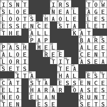 ACROSS 1. Is not 5. Big collection agency 8. Pull behind 11. _ gin 12. Actress Patricia 14. Grow older 15. Plunders 17. White Person, in Hawaii 18. French article 19. Core 21. R.R. building 22. Allow 23. Definite Article 24. Everything 25. Krazy ___ of comics 27. Infant food 28. Oblong pieces of solid material 31. Romantic infatuation 35. Cartoonist voice _ Blanc 37. Toward shelter 38. Medicinal plant 39. To riddle 41. Penny 42. Australian parrot (variant) 43. Teat (slang) 45. Toward the sea 46. Puts into a specified state 47. Beverage made from leaves 49. Call ___ day 51. Actor Linden 52. Eastern Standard Time (abbr.) 55. Feline 57. R.R. building 60. Center 62. Connecticut Ivy Leaguer 63. Ethiopian city, capital of Harari 65. Fertile tracts in a desert 66. Modern: prefix 67. Liveliness 68. The smallest animal of a litter 69. Nine, plus one 70. Compass dir. 71. Arranges properly for use DOWN 1. Small island 2. Splash clumsily 3. Trap for birds or small mammals 4. False hair 5. _ tizzy (2 wds.) 6. Vintage cars 7. Table seasoning 8. Baron Munchausen's specialties 9. Double curve, resembling the letter S 10. Compass direction 13. Path through which fluid escapes 16. Fastener 17. Assistant 20. Dollar (slang) 26. Phillipine bananalike plant 29. French philosopher Descartes 30. Bristle 31. Friends 32. _ vera 33. Decision 34. Robbery 36. Allow 40. One or the other of two 44. Afternoon social gatherings 48. In addition 50. American tennis player Robert 52. Follow as a consequence or result 53. Odor 54. Trials 55. Penny 56. Toward shelter 58. Falsehood 59. Ancient river in northeast Turkey 61. Hearing organs 64. A saturated hydrocarbon