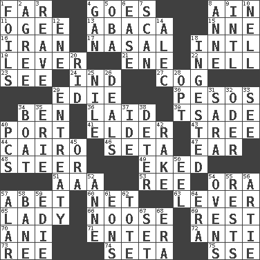 ACROSS 1. At a great distance 4. Leaves 8. The 18th letter of the Arabic alphabet 11. Double curve, resembling the letter S 13. Phillipine bananalike plant 15. Compass dir. 16. SW Asia republic 17. Rhinal 18. International (abbr.) 19. Prying instrument 21. Compass dir. 22. 1994 drama film starring Jodie Foster 23. Perceive with the eye 24. Indiana (abbr.) 27. Gear tooth 29. Singer Brickell 30. Mexican monetary units 34. Benjamin's nick name 36. Put down 39. Sadhe (variant) 40. Left side of a ship or aircraft 41. A person who is older than you are 43. Woody plant 44. Capital of Egypt 46. Stalk of a moss capsule 47. Ewer handle 48. Bull 49. Supplemented with great effort 51. American Automobile Association (abbr.) 53. To riddle 54. Mouth or opening 57. Collude with 60. Fish or hair follower 63. Prying instrument 65. Kenny Rogers chart-topper in '80 66. Trap for birds or small mammals 69. Remainder 70. Black tropical American cuckoo 71. Keyboard key 72. Against 73. To riddle 74. Bristle 75. Compass dir. DOWN 1. Fencing necessities 2. Match 3. Break or tear apart 4. Separate the seeds from cotton 5. Chief or king in Benin or Nigeria 6. Comfort 7. Examine minutely or intensely 8. Queen of England 1702-14 9. International (abbr.) 10. 1994 drama film starring Jodie Foster 12. Compass dir. 14. Actor Baldwin 18. Eaten 20. To free from 25. "Death on the ____" 26. Allots cards 28. Choose 29. Plea 31. "Two Mules for Sister ____" 32. River in Europe 33. Perceive with the eye 34. Water vessel 35. One of the Great Lakes 37. Binary compound 38. Prevent from occurring 40. Personal Computers (abbr.) 42. Libertine 45. Mouth or opening 50. Snakelike fish 52. Singer Murray 54. Baking chambers 55. Musical pauses 56. Nick name for Arthur 57. Having or resembling wings 58. Object of repulsion 59. Singer Brickell 61. Immeasurably long periods of time 62. Lug 64. Epoch 67. Arrange properly for use 68. Period