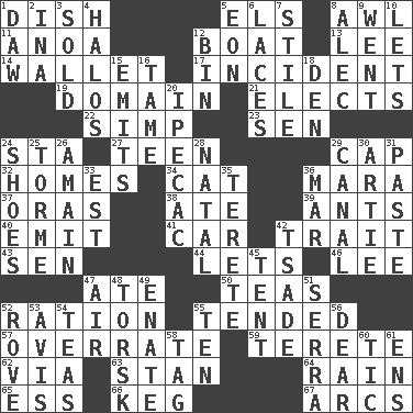 ACROSS 1. Food container 5. Raised railways 8. Leather borer 11. Small Philippine buffalo 12. Water vessel 13. Area sheltered from the wind 14. Place for singles 17. Happening 19. Kingdom 21. Chooses 22. Simple or foolish person 23. Elected rep. 24. R.R. building 27. Adolescent 29. Head covering 32. Dwellings 34. Domesticated feline 36. Hindu Mythology: god of death 37. Mouths or openings 38. Had dinner 39. Pismires 40. Give off 41. 4-wheeled motor vehicle 42. Distinguishing feature 43. Elected rep. 44. Allows 46. Area sheltered from the wind 47. Had dinner 50. Beverages made from leaves 52. Food allowance for one day 55. Looked after 57. Make much ado about nothing 59. Cigar-shaped 62. By way of 63. Comedian Laurel of Laurel & Hardy 64. Water falling in drops from the sky 65. Double-curved letter 66. Cask 67. Arches DOWN 1. Obsolete 2. _ tizzy (2 wds.) 3. Exchanged or delivered for money 4. Rings 5. Age 6. Shoestrings 7. Vertical member of a panel or frame 8. Actor Baldwin 9. Gone 10. Allows 12. Storage container 15. Sends forth 16. Docile 18. Lair 20. Medicinal drug used to evoke vomiting 24. Imelda's hoard 25. Singer Mel 26. With great haste 28. Brizilian seaport 29. Lessep's creation 30. Nick name for Arthur 31. Thick mixture 33. Eastern Standard Time (abbr.) 35. Cylindrical with tapered ends 36. Make imperfect 42. Sadhe (variant) 45. Portable shelter 47. Wind 48. Cod relative 49. Maternal 51. Spanish missionary in California 52. Be footloose 53. Opinion 54. Afternoon social gatherings 55. Nine, plus one 56. Letter starter 58. Label 60. Nervous spasm 61. Followers of ems