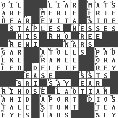 ACROSS 1. Petroleum 4. One who doesn't tell the truth 8. Floor coverings 12. "We ___ not amused" (Victoria) 13. Haggard of country music 14. 4th largest of the Great Lakes 15. Posterior 17. Webber/Rice musical 18. The founder of a family 19. Paper fasteners 21. Makes clutter 23. Part of HMS, perhaps 24. 17th letter of the Greek alphabet 26. To separate or throw off 27. Painter Guido (1575-1642) 28. Armed conflicts 30. Slender fish 31. Ringlike coral islands and reefs 34. Groovy apt. 37. Supplement with great effort 38. Indian princess (variant) 39. Mouth or opening 40. Directed 41. Erase 42. Marina Del _, California 43. Relaxation 44. Fast planes 46. _ Lanka 47. Declare 50. Hearing organ 51. Full of chinks, cracks, or crevices 54. Of or relating to Laos or its people 57. Among 58. To the left, to Queeg 60. "Vaya con ____" 62. Story 63. Check the growth or development of 64. Afternoon social gathering 65. Snake ____ (dice throw) 66. Bits 67. Playfully artful DOWN 1. Boat paddle 2. Angers 3. Resembling or made to resemble leather 4. Prying instrument 5. From or relating to Ireland 6. The first octave above the treble staff 7. 480, 500 or 516 sheets of paper 8. Makes clutter 9. Ascend 10. Become fatigued 11. Perceives with the eye 13. Cartoonist voice _ Blanc 16. Water falling in drops from the sky 20. 23rd letter of the Greek alphabet 22. Blunders 25. A small or young owl 27. Immoral or dissolute person 29. Toward shelter 30. Set 31. Ancient Greek god of war 32. Lies 33. Single 34. Likenesses of persons 35. Ancient Greek god of war 36. 24 hours 41. Raised platform 43. Eats (away) 44. Put into a specified state 45. Stated 46. Grin 48. Verbally 49. Entertaining tales 51. Pace 52. "If ____ say so..." 53. Compass direction 55. Baseball player Mel 56. Christmas carol 59. Parent Teacher Association (abbr.) 61. Declare