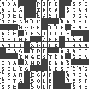 ACROSS 1. Basketball assoc. 4. Corncob 8. Compass dir. 11. Silent film actress Nazimova 13. South American Indian 14. Examine hastily 15. Christmas carol 16. Compass direction 17. Ancient Roman robe 18. Pertaining to the sea 21. French painter Edouard 22. Thickened enlargement 23. Neckwear 25. Compass dir. 26. Adept person 29. One of the two male reproductive glands 32. Distance measurement (Brit.) 34. "We ___ not amused" (Victoria) 35. Third mo. 38. Against 39. Having a sole or soles 41. SW Asia republic 43. Label 44. Binary compound 45. Speak pompously 46. Consumed 50. Ocean 51. Epoch 54. Added to 55. Conclusions 57. Former Milwaukee Brewers owner Bud 59. Nestling 63. Russian ruler of old 64. Mild oath 67. Type of rug 68. Singer James 69. Flatfish 70. State of inaction 71. Compass dir. 72. Exchanged or delivered for money 73. A female animal or person DOWN 1. Billionth: prefix 2. Coalition 3. Toward shelter 4. Parts 5. _ tizzy (2 wds.) 6. Personal Computers (abbr.) 7. Ingest 8. Biscuitlike quick bread 9. Gurus 10. Related on the mother's side 12. Actor Alda or Thicke 14. R.R. building 19. Short letter 20. Binary compound 21. Cartoonist voice _ Blanc 23. Hoop that covers a wheel 24. On the rocks 26. Wet nurse (var.) 27. Penny 28. Singer James 30. Stories 31. Arab leader 33. Swiss mountan, "Queen of the Mountains" 36. Caspian sea tributary 37. Assign a rank or rating to 39. Attach a signature 40. Wrote a lyric poem 42. Teachers' org. 45. Probability 47. Tired old horse 48. Looked after 49. Compass dir. 51. _____ Park, CO 52. Musical pauses 53. Having winglike extensions 56. Play the lead 58. Lyricist Gershwin 60. Angers 61. Tender 62. Yard entry 64. Double-curved letter 65. Thick or sticky substance 66. Everything