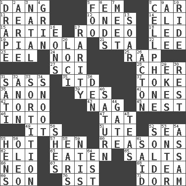 ACROSS 1. Mild oath, euphamism for damn 5. Opposite of masc. 8. Auto 11. Buttocks 12. Washington bills 14. Connecticut Ivy Leaguer 15. Nick name for Arthur 17. Cowboy competition 18. Directed 19. Player piano 21. R.R. building 22. Area sheltered from the wind 23. Snakelike fish 24. Or not 25. Hit sharply and swiftly 27. _-fi 28. "Mermaids" star 31. Backtalk 35. It would 37. Puff or smoke 38. Soon (poet.) 39. It is so 41. Singles 42. "Corrida" creature 43. Tired old horse 45. A home for chicks 46. To the inside or interior of 47. Make lace 49. ___ a Wonderful Life 51. Shoshoni 52. Ocean 55. Being at a high temperature 57. Layer 60. Thinks logically 62. Connecticut Ivy Leaguer 63. Ingested 65. Table seasonings 66. Modern: prefix 67. Indian titles of respect 68. The main thing one is thinking about 69. Manchild 70. Fast jet (abbr.) 71. Dormintory (informal) DOWN 1. Window treatment 2. Nest on high 3. Relating to or accompanying birth 4. Broad smile 5. Egg _ yung 6. Extremities 7. Rendezvous 8. Portable communications device 9. Toward shelter 10. Travel on or in a vehicle 13. Fly high 16. Immeasurably long periods of time 17. Noteworthy scarcity 20. Locales 26. NE Massachussets city 29. Supplements with great effort 30. Relief 31. Suttee (variant) 32. At once, immediately (arch.) 33. Making a chance decision by using lots 34. Snob 36. Lair 40. Titan orbits this 44. Yard entry 48. Beverages made from leaves 50. "______ My Girl" (Turtles hit) 52. Twentieth part of a lira 53. Keyboard key 54. Indian state 55. Coop moms 56. Butter sub 58. Hearing organs 59. Nuclear Threat Initiatives 61. Alleged 64. Eastern Standard Time (abbr.)