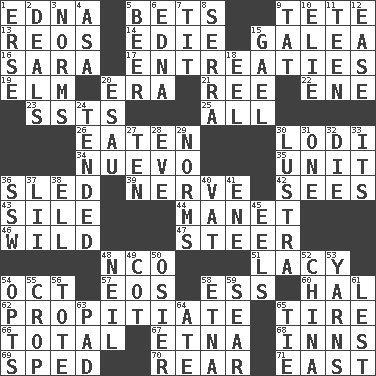 ACROSS 1. Pulitzer Prize-winning author Ferber 5. Stakes 9. Wig 13. Vintage cars 14. Singer Brickell 15. An organ shaped like a helmet 16. "Two Mules for Sister ____" 17. Pleas 19. Shade tree 20. Epoch 21. To sift 22. Compass dir. 23. Fast planes 25. Everything 26. Ingested 30. Farming town in central California 34. New (sp.) 35. A single undivided whole 36. Downhill vehicle 39. Effrontery 42. Observes 43. Drop; flow; fall 44. French painter Edouard 46. Uncontrolled 47. Bull 48. Non-commissioned officer (abbr.) 51. Made of lace 54. Sep. follower 57. Greek goddess of the dawn 58. Curvy letter 60. Actor Linden 62. Appease 65. Become fatigued 66. "_____ Recall" 67. Inactive volcano in Sicily 68. Restaurants 69. Drove too fast 70. Rump 71. 90 degrees DOWN 1. Celtic language 2. Allots cards 3. Typical standards 4. White ___ sheet 5. Fermented drink made from hops 6. Pulitzer Prize-winning author Ferber 7. Teat (slang) 8. Father Junipero _ 9. Make lace 10. Writer Wiesel 11. Adolescent 12. Comfort 15. Highlander 18. Snakelike fish 20. Son of Isaac 24. Watched over 27. "___ Little Indians" 28. First lady 29. Typical standards 30. A period of five years 31. Single 32. Expire 33. It is 36. Compass dir. 37. Cards in a Roman deck? 38. Pipe bend 40. Large container 41. Compass dir. 45. Snakelike fish 48. Famous astronaut Armstrong 49. Small bed 50. Flexible twig of a willow tree 52. Large country 53. Tall tales 54. Elects 55. Riding implement 56. Haul 58. Inactive volcano in Sicily 59. Scorch 61. For fear that 63. Writing tablet 64. Had dinner 65. Neckwear