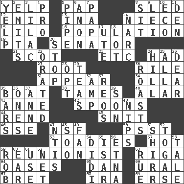 ACROSS 1. Sharp bark 5. Infant food 8. Downhill vehicle 12. Arab leader 13. _ tizzy (2 wds.) 14. Sibling's daughter 15. _ and Stitch 16. Census information 19. Parent Teacher Assoc. 20. Elected representative 21. Native of Scotland 23. And so on (abbr.) 24. Possessed 27. Carrot, for example 30. Cause heat under the collar 31. Seem 34. Water jar 35. Water vessel 38. Corrects by punishment or discipline 40. Having or resembling wings 41. Singer Murray 42. Soup utensils 44. Tear apart 45. In a ____ (agitated or irritated) 46. Compass dir. 47. Overdraft (abbr.) 50. Inconspicuous attention getter 53. Sycophants 57. Being at a high temperature 59. One who advocates reunion 63. Port city in Latvia 64. Fertile tracts in a desert 65. Daniel's nick name 66. Mountain range 67. Cy Young winner Saberhagen 68. Retirement account (abbr.) 69. Celtic language DOWN 1. Sharp bark 2. Sends forth 3. Pale purple color 4. Adept person 5. Corncob 6. Soon (poet.) 7. Dad 8. Be seated 9. Flowery wreath 10. Environmental prefix 11. Lair 14. Drug cop 17. Shoshoni 18. Car dealer's back yard 20. Discontinue 22. Spoke pompously 24. Land elevation 25. Silent film actress Nazimova 26. Letter starter 28. Choose 29. Afternoon social gatherings 30. Exposes to great heat 32. Electrical Unit 33. Vintage cars 35. Taverns 36. Singles 37. Singer Murray 39. Male child 43. Pinches, bites 47. Nuclear Threat Initiatives 48. "Barney Miller" actor Jack 49. Avid follower 51. Bake eggs in their shells 52. Ancient Roman robes 54. "You Light Up My Life" star Conn 55. Astrian river, tributary to the Danube 56. Inactive volcano in Sicily 58. Falsehood 59. Director Reiner 60. Hearing organ 61. Purpose 62. Fish or hair follower 63. Regret