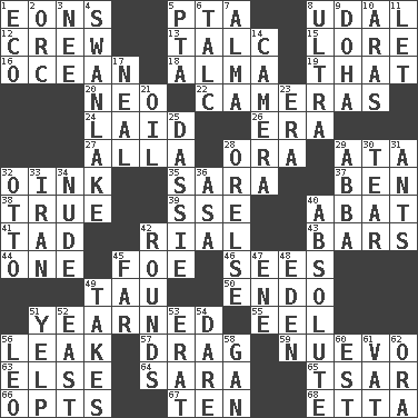 ACROSS 1. Immeasurably long periods of time 5. Parent Teacher Association (abbr.) 8. Allodial 12. Ship's personnel 13. Baby powder 15. Old wives' tales, e.g. 16. Sea 18. _ mater 19. Not this but _ 20. Modern: prefix 22. Devices for capturing images 24. Put down 26. Period 27. Silent film actress Nazimova 28. Mouth or opening 29. "One Day ___ Time" 32. Pig sound 35. "Two Mules for Sister ____" 37. Benjamin's nick name 38. Loyal 39. Compass dir. 40. Blind as ____ 41. Small amount or degree 42. Monetary unit of Yemen 43. Drinking establishments 44. Single 45. Enemy 46. Perceives with the eye 49. The 19th letter of the Greek alphabet 50. Inside; within (prefix) 51. Felt deep pity or tenderness 55. Snakelike fish 56. Path through which fluid escapes 57. To be drawn or hauled along 59. New (sp.) 63. Otherwise 64. "Two Mules for Sister ____" 65. Russian ruler of old 66. Chooses 67. Nine, plus one 68. Singer James DOWN 1. Environmental prefix 2. The grampus (Milton) 3. Born 4. Tchaikovsky ballet 5. Parent Teacher Association (abbr.) 6. Baby powder 7. _ mater 8. Extremist 9. Capital of the state of Qatar 10. Caspian sea tributary 11. Allow 14. Device for capturing images 17. Anneal 21. Petroleum 23. Epoch 25. Hyrax 28. Threatening words 29. Swedish rock group 30. Pull into pieces 31. Pismires 32. "Beetle Bailey" pooch 33. SW Asia republic 34. Unadorned 36. White ___ sheet 40. Utter; complete 42. Periods in a boxing match 45. Distant 47. Compass dir. 48. Genesis locale 49. Proceeds 51. Sharp bark 52. 90 degrees 53. Part of Q.E.F. 54. Have the gumption 56. Lion 58. Separate the seeds from cotton 60. Eastern Standard Time (abbr.) 61. Large container 62. Mouth or opening