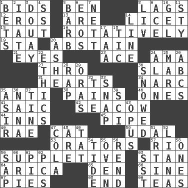 ACROSS 1. Auction offers 5. Benjamin's nick name 8. Fails to keep up a pace 12. Greek god of love 13. "We ___ not amused" (Victoria) 14. It is permitted: Lat. 15. Tense 16. Producing rotation 19. R.R. building 20. Refrain by choice 21. Snake ____ (dice throw) 23. Adept person 24. Nanny (var.) 27. Through, poetically 30. Broad, flat, thick piece 31. Centers 34. Drug cop 35. Opposed to 38. Aches 40. Singles 41. Ketch in the Levant 42. Manatee 44. Restaurants 45. Corncob 46. Actress Charlotte 47. Feline 50. Freehold land 53. Speakers 57. River (Sp.) 59. Supplying deficiencies 63. Comedian Laurel of Laurel & Hardy 64. N. Chile seaport 65. Lair 66. Trig term 67. Sliced desserts 68. Conclude 69. Afternoon social gatherings DOWN 1. Antes 2. Feeling or showing extreme anger 3. A city in N France, SE of Calais 4. Fast jet (abbr.) 5. Sharp remark 6. Greek god of love 7. Remaining after all deductions 8. 54 in ancient Rome 9. Adept person 10. Set 11. Filthy place 14. Actor's bit 17. American Automobile Association (abbr.) 18. Nervous spasm 20. American tennis player Robert 22. Value system 24. ____ Jay Lerner 25. Female horse 26. Lettered men learn these first 28. Reproach for some lapse or misdeed 29. Mouths or openings 30. Frozen precipiation fell 32. Neckwear 33. Fastener 35. SW Saudi Arabia district 36. Nanny 37. Prong on a fork 39. _-fi 43. Musical composition 47. Root beer relative 48. "We ___ not amused" (Victoria) 49. Make lace 51. Nick name for Arthur 52. Climbing, woody, usually tropical vines 54. Event that recurs at intervals 55. Baking chamber 56. Tear apart 58. Washington bills 59. Plant excrement 60. RI univ. 61. Sliced dessert 62. Personal Computers (abbr.) 63. Fast jet (abbr.)