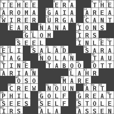 ACROSS 1. Giggle 6. Period 9. Definite Article 12. Odor 13. Greek goddess of the earth (variant) 14. Length times width 15. One who wires 16. Capital and largest city of Mongolia 17. Patter 18. Hearing organ 19. Nanny 20. Charged particles 21. Take by theft 23. Big collection agency 24. Sew up the eyelids of hawks and falcons 25. An arm off of a larger body of water 28. Biblical high priest 30. Vegetable dish 34. "Two Mules for Sister ____" 35. Label 36. Pitcher Ryan 38. The 19th letter of the Greek alphabet 39. Prong on a fork 41. Off limits 43. Baseball player Mel 44. Believer in; advocate of (suffix) 46. Cowardly lion portrayer 48. Bear (Spanish) 49. Female horse 50. Group working together 51. Part of speech 53. Nonscientific branch of learning 56. Silvers or Donahue 57. _ course 58. Relatively large 60. Perceives with the eye 61. Automatically 62. Took without asking 63. Big collection agency 64. Chicken ___ king 65. NE Netherlands city DOWN 1. The 23rd letter of the Hebrew alphabet 2. 4th largest of the Great Lakes 3. Israeli folk dance 4. Develop 5. Hearing organ 6. Merit 7. Capital of Latvia 8. American Automobile Association (abbr.) 9. Interpreter 10. Coop moms 11. Ingest 13. Island territory of the United States 14. Oak nuts 19. Pitcher Ryan 20. One more than two 22. French article 24. Seigniories (variant) 26. Part of Q.E.F. 27. Strained 28. Singer James 29. Den 31. Car dealer's back yard 32. Insect wing 33. Pat or tap gently 37. Pitcher Ryan 40. Artist's stands 42. Boat paddle 45. Immediately 47. Centers of feelings and intuitions 49. Bungle 50. "Mermaids" star 51. Christmas carol 52. Water jar 54. Vintage cars 55. Story 56. Air pressure measure (abbr.) 57. Girls' org. (abbr.) 58. Girls' org. (abbr.) 59. Nine, plus one