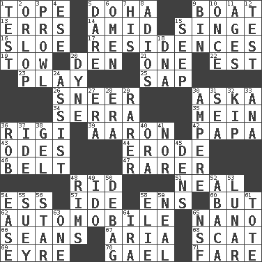ACROSS 1. Drink excessively 5. Capital of the state of Qatar 9. Water vessel 13. Blunders 14. Among 15. Burn superficially 16. A type of plum 17. Homes 19. Pull behind 20. Lair 21. Single 22. Eastern Standard Time (abbr.) 23. Frolic 25. Plant excrement 26. Contemptuous expression 30. "____ silly question..." 34. Father Junipero _ 35. Chow _ 36. Swiss mountan, "Queen of the Mountains" 39. Composer Copland 42. Dad 43. Lyric poems 44. Eat (away) 46. Waist strap 47. Less widely known 48. To free from 51. Actress Patricia 54. Double-curved letter 57. Binary compound 58. Followers of ems 60. Yet 62. Car 65. Billionth: prefix 66. Actors Connery and Penn 67. Roberta Peters solo 68. Jazz singing style 69. Jane of fiction 70. Highlander 71. Conductor's collection DOWN 1. Trial 2. Fourth or lowest deck 3. Move like a hungry wolf 4. Compass dir. 5. Have the gumption 6. Presage 7. Part of HMS, perhaps 8. Goodbye (Sp.) 9. Storage container 10. At one time in the past 11. Eras 12. Trial 15. Ooze 18. Heredity factor (abbr.) 20. Centimeter-gram-second unit of force 24. Aid 27. Period 28. Epoch 29. More uncommon 30. Electrical Unit 31. Ocean 32. Sleep 33. Santa ___, CA 36. Director Reiner 37. Binary compound 38. Set 40. Mouth or opening 41. And not 45. Cub Scout units 48. Basketball hoops 49. Wedding promise 50. Debunk (Brit. slang) 52. Phillipine bananalike plant 53. Type of eclipse 54. Comfort 55. Chop _ 56. Play the lead 58. Writer Wiesel 59. Be tempered by heat 61. Haul 63. Single 64. Lyricist Gershwin 65. Overdraft (abbr.)