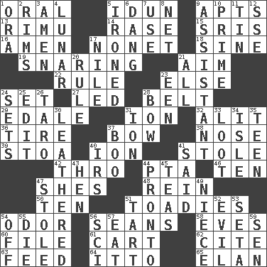 ACROSS 1. Spoken 5. Goddess of spring and wife of Bragi 9. Flats, for short 13. Tall New Zealand timber tree 14. Raze (variant) 15. Indian titles of respect 16. So be it 17. Music written for nine 18. Trig term 19. Catching in a trap 21. Direct toward a target or goal 22. General guideline 23. Otherwise 24. Arrange properly for use 27. Directed 28. Waist strap 29. Peak District village in England 31. Electrically charged atom 32. Came down and settled, as after flight 36. Hoop that covers a wheel 37. Ribbon knot 38. Characteristic smell of wine 39. Portico 40. Electrically charged atom 41. Took without asking 42. Through, poetically 44. Parent Teacher Assoc. 46. Nine, plus one 47. "______ My Girl" (Turtles hit) 48. It's straight from the horse's mouth 50. Nine, plus one 51. Sycophants 54. Aroma 56. Seines 58. Nights before holidays 60. Do some clerical work 61. Draw slowly or heavily 62. Quote 63. Nourish 64. "Tell ____ the Marines!" 65. Liveliness DOWN 1. Mouth or opening 2. Basketball hoops 3. So be it 4. Type of eclipse 5. Pressed 6. Mild oath, euphamism for damn 7. Purpose 8. Fish or hair follower 9. Aide 10. First class 11. Shallow baking pan 12. Compass dir. 17. The longest river in the world 20. Governing power 21. Everything 23. Car or cant ending 24. Arranges properly for use 25. Prepare for publication 26. Pacific island yam 28. Ribbon knot 30. Tough but pliablecoriaceous 31. Electrically charged atom 33. Plunder 34. Small island 35. Adolescent 37. Sometimes accompanies a hiss 40. Big collection agency 41. Expressed in words 43. Layer 44. Right away 45. Beverages made from leaves 47. Took without asking 49. Sibling's daughter 51. Small pie 52. Tending to cause great harm 53. Bristle 54. No longer planned or scheduled 55. Expire 56. _-fi 57. Ingest 59. Elected rep.