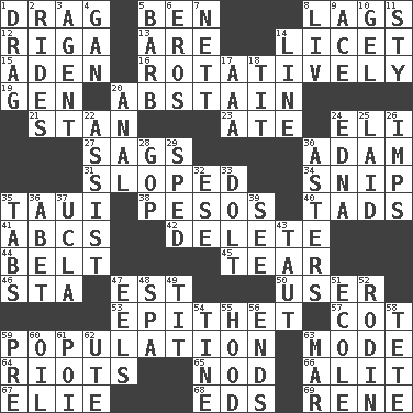 ACROSS 1. To draw with force 5. Benjamin's nick name 8. Fails to keep up a pace 12. Capital of Latvia 13. "We ___ not amused" (Victoria) 14. It is permitted: Lat. 15. An important port of Yemen 16. Producing rotation 19. Commissioned military rank (abbr.) 20. Refrain by choice 21. Comedian Laurel of Laurel & Hardy 23. Had dinner 24. Connecticut Ivy Leaguer 27. Sinks 30. First man 31. Had an oblique or slanted direction 34. Sever or remove by pinching or nipping 35. "Change" in Tahitian 38. Mexican monetary units 40. Small boys 41. Lettered men learn these first 42. Keyboard key 44. Waist strap 45. Pull into pieces 46. R.R. building 47. Eastern Standard Time (abbr.) 50. One who makes use of a thing 53. Curse 57. Small bed 59. Census information 63. Method 64. Disturbances 65. Dreamland 66. Came down and settled, as after flight 67. Writer Wiesel 68. Begley and Asner 69. French philosopher Descartes DOWN 1. To trail on the ground 2. Amusement-park features 3. Rep 4. Separate the seeds from cotton 5. Sharp remark 6. Greek god of love 7. Remaining after all deductions 8. 54 in ancient Rome 9. Adept person 10. Set 11. Filthy place 14. Actor's bit 17. Auto club (abbr.) 18. Teat (slang) 20. Of or related to the anus 22. Aid 24. Pulitzer Prize-winning author Ferber 25. Put down 26. Naughty children 28. Grand Old Party 29. Hurried 30. Michaelmas daisies 32. Compass dir. 33. Dunce 35. Bar bills 36. Collude with 37. Southern CA. univ. 39. Observe 43. Drawn tight 47. Snakelike fish 48. Health resort 49. Teat (slang) 51. Learning spot: Fr. 52. "The Thinker" sculptor 54. Prong on a fork 55. Parka part 56. Extremities 58. False hair 59. Before (prefix) 60. Lubricate 61. Luau course 62. Shoshoni 63. Spoil