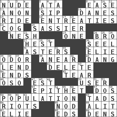 ACROSS 1. Naked 5. "One Day ___ Time" 8. Relaxation 12. Soon (poet.) 13. Small drink 14. Natives or inhabitants of Denmark 15. Travel on or in a vehicle 16. Pleas 19. Gear tooth 20. More lively and spirited 21. Delicate 23. Single 24. Sis' sibling 27. Behest 30. Sew up the eyelids of hawks and falcons 31. Michaelmas daisies 34. Writer Wiesel 35. Scent 38. Approach 40. Mild oath, euphamism for damn 41. Grant temporary use of 42. Keyboard key 44. Extremities 45. Pull apart 46. Bear (Spanish) 47. Eastern Standard Time (abbr.) 50. One who makes use of a thing 53. Curse 57. Two (Sp.) 59. Census information 63. Small amounts or degrees 64. Debaucheries 65. Allow head to fall sleepily 66. Came down and settled, as after flight 67. Writer Wiesel 68. Begley and Asner 69. Habitations of wild animals DOWN 1. Drug cop 2. The state of being joined or united 3. Evade 4. Compass dir. 5. At sea 6. Canisters 7. Flats, for short 8. Consume 9. Black tropical American cuckoo 10. Perceive with the eye 11. Curvy letter 14. Have the gumption 17. _ de Janeiro 18. Car or cant ending 20. "______ My Girl" (Turtles hit) 22. Pottery fragments 24. Actor Lugosi 25. It's straight from the horse's mouth 26. Cassini of fashion 28. R.R. building 29. Look after 30. Spring feasts 32. To separate or throw off 33. Table seasoning 35. Margarine 36. Hiding places for outlaws 37. Southwest Nigerian state 39. To separate or throw off 43. Pulled tight 47. Snakelike fish 48. Health resort 49. Teat (slang) 51. Peak District village in England 52. "The Thinker" sculptor 54. Prong on a fork 55. Parka part 56. Conclusions 58. Fast planes 59. Before (prefix) 60. Lubricate 61. Luau course 62. Shoshoni 63. Bit