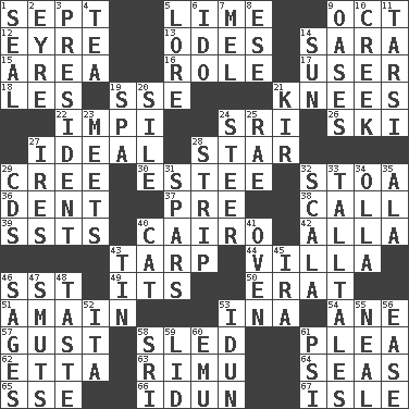 ACROSS 1. Back-to-school mo. 5. Welles in "The Third Man" 9. Sep. follower 12. Jane of fiction 13. Lyric poems 14. "Two Mules for Sister ____" 15. Type of rug 16. Hero or heavy, e.g. 17. One who uses or employs something 18. French article 19. Compass dir. 21. Leg joints 22. Body of Kaffir warriors 24. Indian title of respect (Mr.) 26. What Jean-Claude Killy likes to do 27. Perfect 28. Play the lead 29. Algonquian 30. First name in cosmetics 32. Portico 36. Scratch 37. Before (prefix) 38. Give a ring to 39. Fast planes 40. Capital of Egypt 42. Silent film actress Nazimova 43. Canvas cover 44. Country estate 46. Fast jet (abbr.) 49. ___ a Wonderful Life 50. Part of Q.E.F. 51. With great haste 53. _ tizzy (2 wds.) 54. A saturated hydrocarbon 57. Abrupt rush of wind 58. Downhill vehicle 61. Entreaty 62. Singer James 63. Tall New Zealand timber tree 64. Oceans 65. Compass dir. 66. Goddess of spring and wife of Bragi 67. Small island DOWN 1. Lick closed 2. Jane of fiction 3. Elected leader of a country 4. Beverage made from leaves 5. Old wives' tales, e.g. 6. Wedding promise 7. Cartoonist voice _ Blanc 8. Compass dir. 9. Fertile tracts in a desert 10. Small stream 11. Tarsus (plural) 14. Player for Phoenix 19. Health resort 20. Drop; flow; fall 21. Apertif with cassis 23. Confronts 24. Navigate 25. Actress Charlotte 27. Angers 28. Empty completely 29. Music discs 31. Practice fights 32. Any of the three canals of the cochlea 33. Baron Munchausen's specialties 34. Spanish pot 35. According to 40. Domesticated feline 41. Baking chamber 43. Shallow baking pan 45. Lyricist Gershwin 46. Gurus 47. Obscenities 48. Clothes sense 52. Call ___ day 53. Goddess of spring and wife of Bragi 55. Anneal 56. Relaxation 58. Indian title of respect (Mr.) 59. Flaplike covering 60. Australian flightless bird 61. Air pressure measure (abbr.)