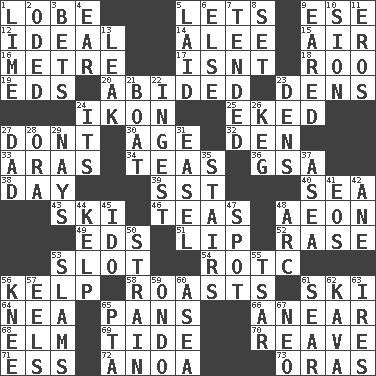 ACROSS 1. Ear part 5. Allows 9. Compass dir. 12. Standard of perfection 14. Toward shelter 15. Atmosphere 16. Distance measurement (Brit.) 17. Is not 18. Friend of Pooh 19. Begley and Asner 20. Tolerated 23. Cub Scout units 24. Visual representation of an object 25. Supplemented with great effort 27. Do not 30. Personal question 32. Lair 33. Ancient river in northeast Turkey 34. Afternoon social gatherings 36. Girls' org. (abbr.) 38. 24 hours 39. Fast jet (abbr.) 40. Ocean 43. What Jean-Claude Killy likes to do 46. Afternoon social gatherings 48. A really long time 49. Begley and Asner 51. Mouth edge 52. To erase 53. Narrow opening 54. College mil. group 56. Seaweed 58. Cooks with dry heat, as in an oven 61. What Jean-Claude Killy likes to do 64. Teachers' org. 65. Zero-star reviews 66. Approach 68. Shade tree 69. Event that recurs at intervals 70. Rob, plunder, or pillage 71. Curvy letter 72. Small Philippine buffalo 73. Mouths or openings DOWN 1. Welles in "The Third Man" 2. Wrote a lyric poem 3. Stakes 4. Ewer handle 5. Put down 6. Otherwise 7. Looked after 8. Put into a specified state 9. Having ears or earlike features 10. The Jewish people; Israel 11. Greek god of love 13. Path through which fluid escapes 21. Water vessel 22. Eat 23. Habitations of wild animals 24. ___ a Wonderful Life 26. Cask 27. June honoree 28. Mouth or opening 29. Negative votes 31. Artist's stand 35. Flight of steps 37. Toward the sea 41. Greek goddess of the dawn 42. One (Scot) 44. Seaweed 45. Wedding promise 47. Blemish 48. Curve 50. Put through a sieve 53. Hits or strikes with great force 55. Russian ruler of old 56. Leg joint 57. Snakelike fish 59. Southwest Nigerian state 60. Toward the sea 61. Shrivel 62. Polynesian shrub of the pepper family 63. Angers 65. Parent Teacher Association (abbr.) 67. Modern: prefix