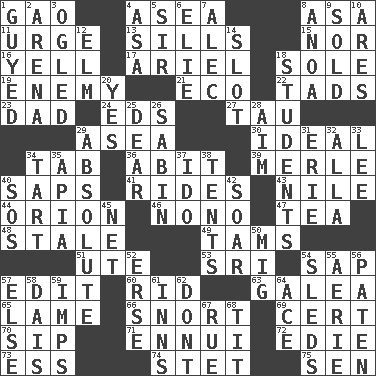 ACROSS 1. E Mali city 4. Toward the sea 8. White ___ sheet 11. Goad 13. Beverly of Met fame 15. Or not 16. Shout 17. Satellite of Uranus 18. Flatfish 19. Foe 21. Environmental prefix 22. Small boys 23. June honoree 24. Begley and Asner 27. The 19th letter of the Greek alphabet 29. At sea 30. Standard of perfection 34. Keyboard key 36. "This won't hurt ____!" 39. Haggard of country music 40. Plant excrements 41. Amusement-park features 43. Mediterranean tributary 44. Greek mythologigal hunter 46. Words to Nanette 47. Beverage made from leaves 48. Showing deterioration from age 49. Scottish caps 51. Shoshoni 53. _ Lanka 54. Plant excrement 57. Prepare for publication 60. To free from 63. An organ shaped like a helmet 65. Unable to walk 66. Derisive sound 69. Sure thing 70. Small drink 71. World-weariness 72. Singer Brickell 73. Curvy letter 74. Proofreading order 75. Elected rep. DOWN 1. Steadied 2. Sports stadium 3. Stared at amorously 4. White ___ sheet 5. Title for a knight 6. Writer Wiesel 7. Actor Baldwin 8. Small Philippine buffalo 9. Disposed of to a purchaser 10. Ancient Greek god of war 12. Shade tree 14. Narrow opening 18. SAT takers 20. Affirmative reply 25. Letter starter 26. Unit of acoustic absorption 28. Direct toward a target or goal 29. Utter; complete 31. One of the Great Lakes 32. Silent film actress Nazimova 33. Area sheltered from the wind 34. Small pie 35. Capital of Western Samoa 37. Wedding promise 38. Portable shelters 40. Distress signal 42. Fly high 45. Fish or hair follower 50. Russian fighter aircraft 52. Celtic language 54. Bobsleighs 55. Nest on high 56. Eucharist need 57. Otherwise 58. Raised platform 59. Naughty children 61. Taverns 62. Do not 64. Adept person 67. Sorrow 68. Teat (slang)