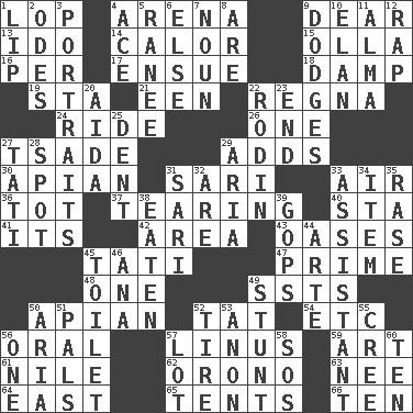 ACROSS 1. Trim (branches) 4. Sports stadium 9. Letter starter 13. Wedding promise 14. Bodily heat indicating an inflammation 15. Spanish pot 16. For each 17. Take place subsequently 18. Moist 19. R.R. building 21. Car or cant ending 22. Canadian anthropologist Darnell 24. Travel on an animal 26. Single 27. Sadhe (variant) 29. Does sums 30. Bee-related 31. Indian skirt 33. Wind 36. Small child 37. Lacerating 40. R.R. building 41. It is 42. Length times width 43. Fertile tracts in a desert 45. Jacques of French films 47. First class 48. Single 49. Fast planes 50. Bee-related 52. Make lace 54. And so on (abbr.) 56. Relating to the mouth 57. "_ and Lucy" (Charlie Brown theme song) 59. Tate display 61. The longest river in the world 62. U. of Maine site 63. Born 64. Compass direction 65. Portable shelters 66. Nine, plus one DOWN 1. Mouth edge 2. Lyric poems 3. Likenesses of persons 4. Adept person 5. Indian princess (variant) 6. Otherwise 7. Part of speech 8. "We ___ not amused" (Victoria) 9. Evades 10. Enthusiasm 11. _ mater 12. Strike 20. Opera by Verdi 22. "The Thinker" sculptor 23. Conclude 25. Scratch 27. Jacques of French films 28. Blemish 29. Roberta Peters solo 31. Indian skirt 32. "We ___ not amused" (Victoria) 33. Helper 34. A whole individual unit 35. To erase 38. Ingested 39. Republicans 44. Johnson of "Laugh-In" 45. Bathroom plumbing fixture 46. Santa ___, CA 49. Difficult or unusual or dangerous feat 50. Operatic vocal solo 51. Friends 52. Hoop that covers a wheel 53. At once, immediately (arch.) 55. Algonquian 56. Single 57. Car dealer's back yard 58. Distress signal 60. "___ Little Indians"