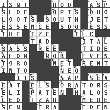 ACROSS 1. Is not 5. Friend of Pooh 8. Viper 11. _ gin 12. Chooses 14. Superhero pair 15. Plunders 17. _ pole 18. _ stream 19. Gist 21. "Barney Miller" actor Jack 22. Double-curved letter 23. Definite Article 24. Ending with capital 25. Affectionate concern, for short 27. Small boy 28. Slanted text style (abbr.) 31. Backtalk 35. To riddle 37. Event that recurs at intervals 38. A really long time 39. Director Reiner 41. Nights before holidays 42. "Corrida" creature 43. Fish or hair follower 45. Monthly bill 46. To the inside or interior of 47. Modern: prefix 49. It is 51. Plant excrement 52. Ocean 55. Ingest 57. Raised railways 60. Speakers 62. Biblical high priest 63. Eucharist need 65. Radiant circles of light 66. Lion 67. Russian ruler 68. Ancient Persian 69. Elected rep. 70. Epoch 71. Locale of original sin DOWN 1. Small island 2. Make a splashing sound 3. Trap for birds or small mammals 4. Wig 5. Friend of Pooh 6. Musical composition 7. Von Bismarck 8. Descriptive word 9. Takes to court 10. Plant holders 13. Went for two points 16. In a ____ (agitated or irritated) 17. Sowing specialist 20. Russian ruler of old 26. 61 cubic inches 29. An important port of Yemen 30. For fear that 31. Suttee (variant) 32. Period of immesurable duration 33. Making a chance decision by using lots 34. Snout, nose 36. Age 40. Gillaume's butler role 44. Rend 48. Brightly colored fish 50. Back-to-school mo. 52. Having a sole or soles 53. Eat (away) 54. NE Netherlands city 55. Snakelike fish 56. Toward shelter 58. Goldbrick 59. Play the lead 61. Not wild 64. Epoch