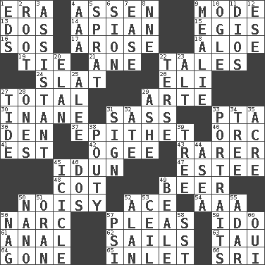 ACROSS 1. Epoch 4. NE Netherlands city 9. Method 13. Two (Sp.) 14. Bee-related 15. Armor plate that protects the chest 16. Distress signal 17. Came up 18. Medicinal plant 19. Neckwear 21. One (Scot) 22. Lies 24. Narrow board 26. Connecticut Ivy Leaguer 27. "_____ Recall" 29. Johnson of "Laugh-In" 30. Lacking in sense or substance 31. Backtalk 33. Parent Teacher Assoc. 36. Lair 37. Curse 40. The grampus (Milton) 41. Eastern Standard Time (abbr.) 42. Double curve, resembling the letter S 43. More valued for its uncommonness 45. Goddess of spring and wife of Bragi 47. First name in cosmetics 48. Small bed 49. Fermented drink made from hops 50. Annoyingly loud 52. Adept person 54. Auto club (abbr.) 56. Drug cop 57. Entreaties 59. Wedding promise 61. Of or related to the anus 62. Moves on water 63. The 19th letter of the Greek alphabet 64. Went 65. An arm off of a larger body of water 66. _ Lanka DOWN 1. Begley and Asner 2. Carrot, for example 3. Helper 4. American Automobile Association (abbr.) 5. Small fatty European fish 6. The Jewish people; Israel 7. Comfort 8. Compass dir. 9. Ear of corn 10. Stare at amorously 11. "Vaya con ____" 12. Compass dir. 20. Style 22. Laconic 23. Keyboard modifier key 25. Toward shelter 27. Periodic rise and fall of the sea level 28. Singles 29. American tennis player Robert 31. Signal 32. Had dinner 33. Likenesses of persons 34. Relationship diagram 35. Measure of real estate 38. Inclined to pout 39. Relationship diagram 44. At sea 45. Tapering mass of hanging ice 46. Two (Sp.) 49. Memphis, Tenn. Street 50. Billionth: prefix 51. Northwest Algerian city 52. ____ Jay Lerner 53. To provide with a ceiling 55. The sixth month of the Jewish calendar 56. Tired old horse 57. 23rd letter of the Greek alphabet 58. Fast jet (abbr.) 60. Fr. "Yes"