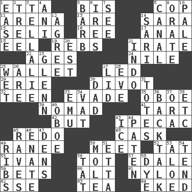 ACROSS 1. Singer James 5. Again 8. Police officer (slang) 11. Sports stadium 13. "We ___ not amused" (Victoria) 14. "Two Mules for Sister ____" 15. Major League Baseball Commissioner Bud 16. To separate or throw off 17. Of or related to the anus 18. Snakelike fish 19. Confederate soldiers (slang) 21. Feeling or showing extreme anger 22. Matures 24. The longest river in the world 25. Place for singles 27. Directed 29. 4th largest of the Great Lakes 30. A piece of turf (Scot.) 32. Adolescent 33. Dodge 35. Mitch Miller's instrument 39. Roamer 41. Small pie 42. Yet 43. Medicinal drug used to evoke vomiting 45. Redecorate 48. Keg 49. Indian princess (variant) 50. Rendezvous 52. Make lace 55. _ the terrible 56. Small child 57. Peak District village in England 59. Wagers 60. Keyboard modifier key 61. High-strength synthetic material 62. Compass dir. 63. Afternoon social gathering 64. Made supply last DOWN 1. Relaxation 2. Relationship diagram 3. Copy Pinocchio 4. Cuckoo 5. Sharp remark 6. Angers 7. Observe 8. Lessep's creation 9. Declaim 10. Light colored 12. Match 14. Indian skirt 20. Eastern Standard Time (abbr.) 21. Southeast Asian peninsula 23. American astronaut and politician John 25. Soggy 26. "We ___ not amused" (Victoria) 27. Flaplike covering 28. Night before a holiday 30. June honoree 31. Lugs 33. Australian flightless bird 34. Large container 36. Sass 37. Mouth or opening 38. And so on (abbr.) 40. Mitch Miller's instrument 43. Frozen water 44. Eucharist need 45. All-night dance parties 46. Maternal 47. Lairs 49. Chest bones 50. Undercover agent 51. Singer James 53. _ vera 54. Watch over 56. Make lace 58. Color