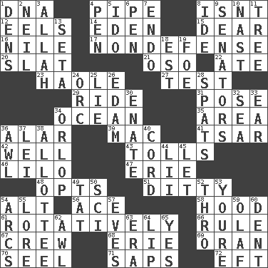 ACROSS 1. Heredity factor (abbr.) 4. Corncob 8. Is not 12. Snakelike fish 14. Locale of original sin 15. Letter starter 16. Mediterranean tributary 17. Unrelated to defense, as in spending 20. Narrow board 21. Bear (Spanish) 22. Had dinner 23. White Person, in Hawaii 27. Trial 29. Travel on or in a vehicle 31. Airs 34. Sea 35. Length times width 36. Having or resembling wings 39. Apple computer (short form) 41. Russian ruler of old 42. Water source 43. For Whom the Bell _____ 46. _ and Stitch 47. One of the Great Lakes 48. Elects 51. Short, simple song 54. Keyboard modifier key 56. Adept person 58. Parka part 61. Happening in regular succession 66. General guideline 67. Group working together 68. 4th largest of the Great Lakes 69. NW Algerian seaport 70. Sew up the eyelids of hawks and falcons 71. Plant excrements 72. Bank Draft (abbr.) DOWN 1. Hiding places for outlaws 2. Famous astronaut Armstrong 3. Assad's deity 4. Fenced enclosure 5. Wedding promise 6. Writing instrument 7. Inside; within (prefix) 8. Binary compound 9. Legislators 10. Political cartoonist Thomas 11. Relationship diagram 13. Stalk of a moss capsule 18. Eastern Standard Time (abbr.) 19. Enemy 24. The grampus (Milton) 25. Falsehood 26. Dutch treat 28. Arguments over trivial matters 30. Related on the mother's side 32. Ocean 33. Hearing organ 34. Fourth or lowest deck 36. Leather borer 37. Flowery wreath 38. One to whom something is allotted 40. Drawstring 44. Cards in a Roman deck? 45. Allow 49. Make lace 50. _-fi 52. Through, poetically 53. You are 54. Arches 55. Old wives' tales, e.g. 57. Nights before holidays 59. Norwegian king 60. Scratch 62. Leather borer 63. Epoch 64. Mouth edge 65. It is so
