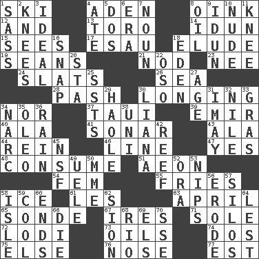 ACROSS 1. What Jean-Claude Killy likes to do 4. An important port of Yemen 8. Pig sound 12. Plus 13. "Corrida" creature 14. Goddess of spring and wife of Bragi 15. Observes 17. He sold his birthright 18. Evade 19. Actors Connery and Penn 21. Dreamland 23. Born 24. Narrow boards 26. Ocean 28. Romantic infatuation 30. Yearning 34. Or not 37. "Change" in Tahitian 39. Arab leader 40. According to 41. Underwater navigation system 43. Chicken ___ king 44. It's straight from the horse's mouth 46. Actor's bit 47. It is so 48. Eat 51. Period of immesurable duration 54. Opposite of masc. 55. Strips of potato fried in deep fat 58. Frozen water 61. French article 63. Showery time 65. Something which is sent 67. Angers 71. Not divided or shared with others 72. Farming town in central California 73. Lubricates 74. Two (Sp.) 75. Otherwise 76. Olfactory organ 77. Eastern Standard Time (abbr.) DOWN 1. Backtalk 2. Leg joints 3. Perfect 4. Had dinner 5. Two (Sp.) 6. Period 7. Part of speech 8. Lubricate 9. Goddess of spring and wife of Bragi 10. Unadorned 11. Leg joint 16. Fastener 18. Genesis locale 20. R.R. building 22. Bear (Spanish) 25. Fast planes 27. Grow older 29. White Person, in Hawaii 30. Climbing, woody, usually tropical vines 31. "If ____ say so..." 32. The longest river in the world 33. Pate de foie ____ 34. Drug cop 35. Butter sub 36. Water falling in drops from the sky 38. Corn or form start 42. Coral collection 45. Overdraft (abbr.) 49. Ubangi River tributary 50. Madame (abbr.) 52. Mouth or opening 53. Cuts off 56. Eat (away) 57. Grain storage towers 58. Capri or Wright 59. Calm and collected 60. Extremities 62. The Jewish people; Israel 64. For fear that 66. Pass on 68. _ de Janeiro 69. Raised railways 70. Compass dir.