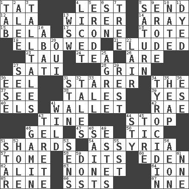 ACROSS 1. Make lace 4. For fear that 8. Transmit 12. Wing 13. One who wires 14. Like ___ of sunshine 15. Actor Lugosi 17. Biscuitlike quick bread 18. Carryall 19. Shoved, as through a crowd 21. Evaded 23. The 19th letter of the Greek alphabet 24. Beverage made from leaves 26. "We ___ not amused" (Victoria) 27. Suttee (variant) 28. Smile widely 30. Snakelike fish 31. A viewer who gazes fixedly 34. Definite Article 37. Observe 38. Stories 39. Affirmative reply 40. Raised railways 41. Place for singles 42. Actress Charlotte 43. Prong on a fork 44. Close up, plug up 46. Set 47. Compass dir. 50. Nervous spasm 51. Pottery fragments 54. Nineveh was its capital 57. Heavy book 58. Proofreads 60. Paradise 62. Set down 63. Music written for nine 64. Electrically charged atom 65. French philosopher Descartes 66. Fast planes 67. Compass dir. DOWN 1. Bar bill 2. Toward shelter 3. Baron Munchausen's specialties 4. It is permitted: Lat. 5. Eat (away) 6. Elected rep. 7. Relationship diagram 8. Titan orbits this 9. Wear away 10. Nathan's nickname 11. Colored 13. Compass dir. 16. Blind as ____ 20. Fr. "Yes" 22. Den 25. Match 27. Sew up the eyelids of hawks and falcons 29. State of inaction 30. Compass dir. 31. Comedian Laurel of Laurel & Hardy 32. Stories 33. 100% 34. Polypeptide antibiotic 35. Pile 36. Compass dir. 41. Uncontrolled 43. Cylindrical with tapered ends 44. Filthy place 45. Become fatigued 46. Homeless child 48. Virtuous person 49. _____ Park, CO 51. Play the lead 52. Hollow 53. Elected reps. 55. Fast jet (abbr.) 56. A really long time 59. Two (Sp.) 61. Compass dir.