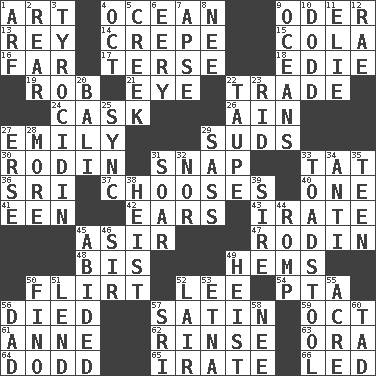 ACROSS 1. Nonscientific branch of learning 4. Sea 9. Baltic tributary 13. Marina Del _, California 14. Streamer paper 15. Root beer relative 16. Distant 17. Laconic 18. Singer Brickell 19. Director Reiner 21. Sight organ 22. Exchange 24. Keg 26. The 18th letter of the Arabic alphabet 27. Poet Dickinson 29. Beer foam 30. "The Thinker" sculptor 31. Fastener 33. Make lace 36. Indian title of respect (Mr.) 37. Opts 40. Single 41. Car or cant ending 42. Hearing organs 43. Feeling or showing extreme anger 45. SW Saudi Arabia district 47. "The Thinker" sculptor 48. Again 49. Is hesitant and indecisive 50. Seductive woman who exploits men 52. Area sheltered from the wind 54. Parent Teacher Association (abbr.) 56. Passed on 57. Smooth fabric 59. Sep. follower 61. Singer Murray 62. Wash lightly 63. Mouth or opening 64. Texas town _ City 65. Feeling or showing extreme anger 66. Directed DOWN 1. Sandy's bark 2. Bring up, as a child 3. Polypeptide antibiotic 4. Sep. follower 5. Small stream 6. Suggestive of the supernatural 7. Domed church section 8. Born 9. Seas 10. Texas town _ City 11. Writer Wiesel 12. Actress Charlotte 20. Indonesian resort city 22. Grayish beige 23. To free from 25. Synchronize (abbr.) 27. Celtic language 28. Greater amount 29. Backtalk 31. Fly high 32. Not either 33. Inedible or poisonous agaric 34. Against 35. Adolescent 38. Robbery 39. The founder of a family 44. Frolic 45. Tolerated 46. Title for a knight 49. Robbery 50. A pale, very dry sherry 51. Grant temporary use of 52. Den 53. Inactive volcano in Sicily 55. Measure of real estate 56. June honoree 57. _ Lanka 58. Born 60. Small boy