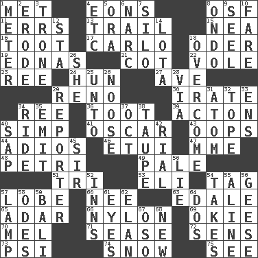 ACROSS 1. Was introduced to 4. Immeasurably long periods of time 8. Order of Saint Francis (abbr.) 11. Blunders 13. Get behind 15. Teachers' org. 16. A blast of a horn 17. Monte _, Las Vegas Hotel/Casino 18. Baltic tributary 19. Ferber et al. 21. Small bed 22. Grand slam 23. To riddle 24. Attila the _ 27. "___ Maria" 29. Western Nevada city 30. Feeling or showing extreme anger 34. To sift 36. A blast of a horn 39. NE Massachussets city 40. Simple or foolish person 41. Motion picture award 43. I made a mistake 44. Goodbye (Sp.) 46. Needle holder 47. Madame (abbr.) 48. _ dish (used to culture cells) 49. Diluted with white 51. Three (prefix) 53. Connecticut Ivy Leaguer 54. Label 57. Ear part 60. Born 63. Peak District village in England 65. The sixth month of the Jewish calendar 66. High-strength synthetic material 69. Migrant worker of the '30s 70. Cartoonist voice _ Blanc 71. Gospel singer Marvin 72. Elected reps. 73. Air pressure measure (abbr.) 74. Frozen precipitation 75. Perceive with the eye DOWN 1. Distance measurement 2. Eat (away) 3. Marketplace scale 4. And so on (abbr.) 5. Mouth or opening 6. Drug cop 7. Grain storage tower 8. Southwest Nigerian state 9. Stitch closed the eyes of (a falcon) 10. Conductor's collection 12. R.R. building 14. Globular water bottle used in Asia 18. Conquer 20. A female animal or person 25. To (old English) 26. Trap for birds or small mammals 28. By way of 29. Newsperson 31. Tiny particle 32. Drink excessively 33. Followers of ems 34. Travel on or in a vehicle 35. Send forth 37. Sep. follower 38. Grayish beige 40. Plant excrement 42. Monetary unit of Yemen 45. Title for a knight 50. Untruth 52. Lodging establishments 54. Proceeds 55. Place in a line 56. Honkers 57. Desk light 58. Lyric poems 59. Indonesian resort city 61. Sight organs 62. Style 64. Two (Sp.) 67. Bear (Spanish) 68. ___ Haven, CT
