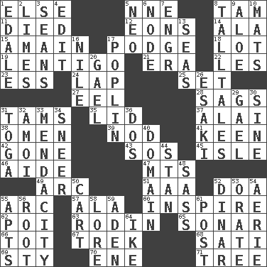 ACROSS 1. Otherwise 5. Compass dir. 8. Scottish cap 11. Passed on 12. Immeasurably long periods of time 14. In the manner of 15. At full speed 17. Porridge 18. Car dealer's back yard 19. Small, flat, pigmented spot on the skin 21. Period 22. French article 23. Double-curved letter 24. Pet locale 25. Arrange properly for use 27. Snakelike fish 28. Settles 31. Scottish caps 35. Hat (slang) 37. Jai _ 38. Sign of something about to happen 39. Dreamland 41. Peachy ____! 42. Went 43. Mayday 45. Small island 46. Assistant 47. Mountains (abbr.) 49. Curve 51. American Automobile Association (abbr.) 52. ___ good deed 55. Curve 57. Insect wing 60. Stimulate to action 62. Luau course 63. "The Thinker" sculptor 65. Underwater navigation system 66. Small child 67. Long journey 68. Suttee (variant) 69. Filthy place 70. Compass dir. 71. Relationship diagram DOWN 1. Peak District village in England 2. Citrus fruits 3. Actors Connery and Penn 4. Prepare for publication 5. Modern: prefix 6. Connecting point 7. Engineer (abbr.) 8. Baron Munchausen's specialties 9. Medicinal plant 10. Floor protectors 13. Oceans 16. The longest river in the world 17. Cotton for raincoats, e.g. 20. Highlander 26. 1973 Nobel Price Winner (Physics) Leo 29. Highlander 30. Trig term 31. Ancient Roman robe 32. Mine, in Marseilles 33. Ananias' fault 34. Scornful expression 36. Two (Sp.) 40. Realm 44. Comedian Laurel of Laurel & Hardy 48. Backtalk 50. Heavy open wagon 52. Middle Eastern gold or silver currency 53. Declaim 54. Nest on high 55. Tenement units (abbr.) 56. Carrot, for example 58. Old wives' tales, e.g. 59. Arabian gulf 61. Mail 64. Mamie's husband